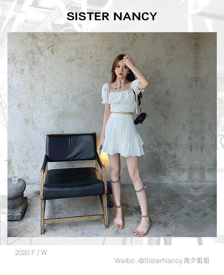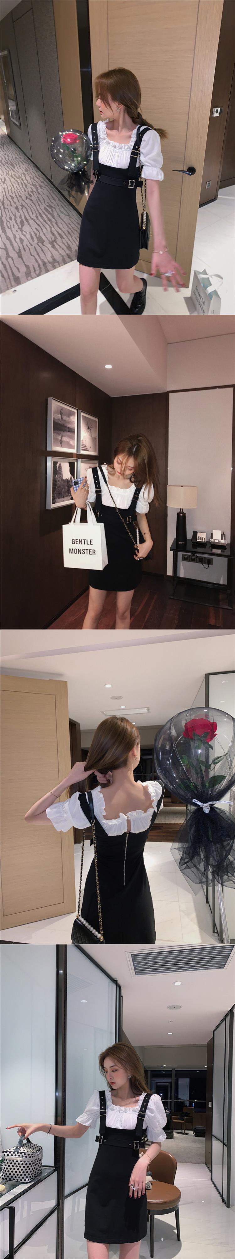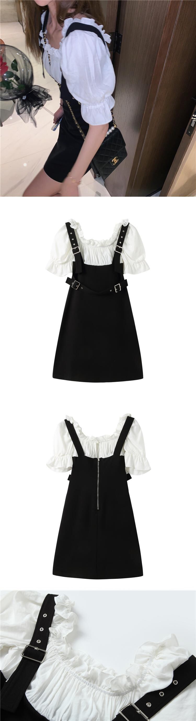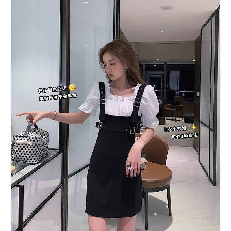 南西姉妹カスタムフェイクツーピースドレス女性2021年夏新しい小さなステッチパフスリーブサスペンダースカート s2812180802956947