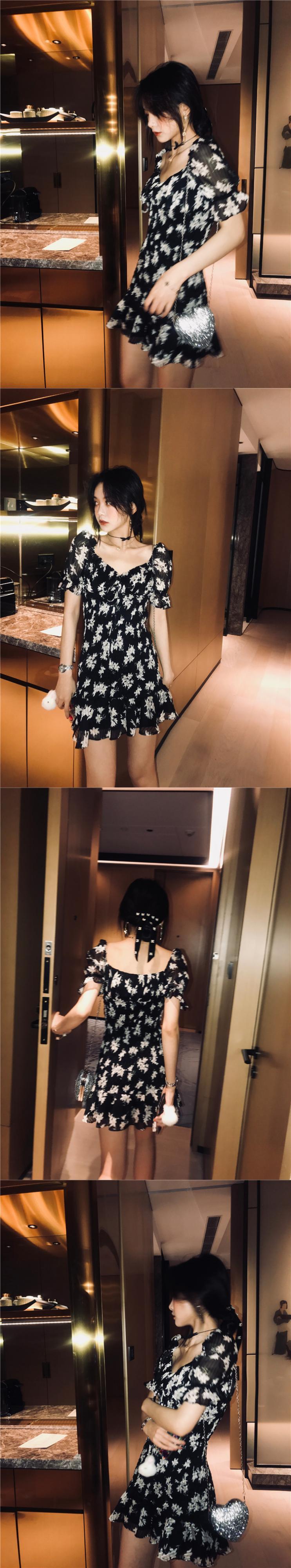 南西姉妹花柄ドレス女性2021年新夏レトロ香港フレーバースモールフレッシュランタンスリーブVネックAラインスカート s2812196824180359
