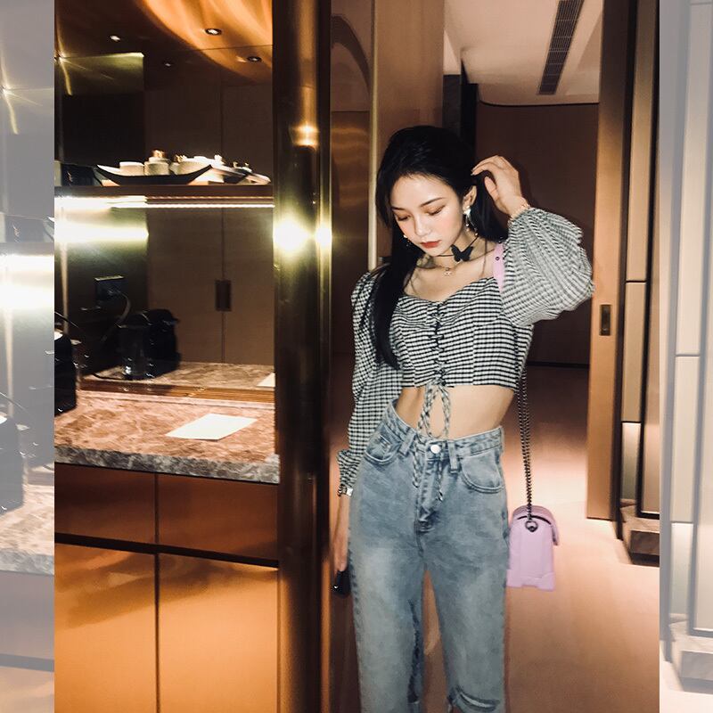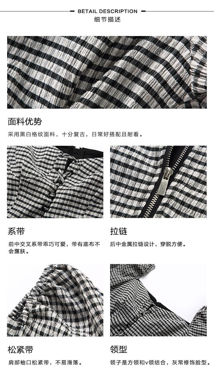 南西姉妹黒と白の格子縞のシャツ女性2021年新しい長袖バブルスリーブセクシーな鎖骨トップタイド s281213914979691