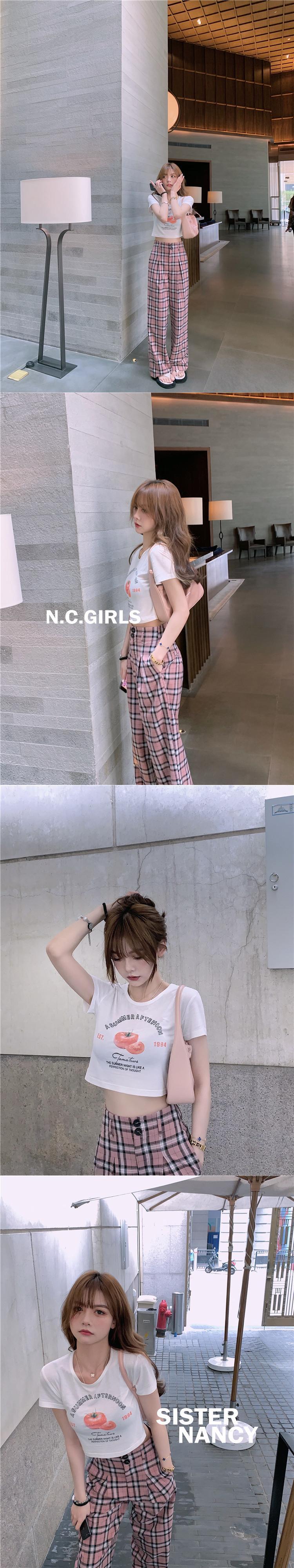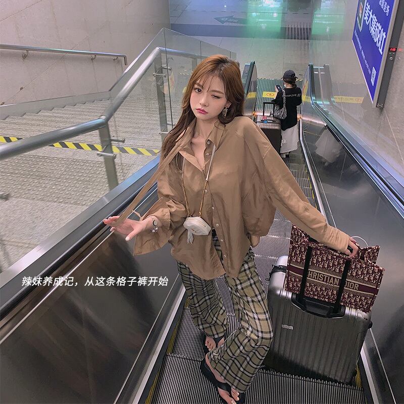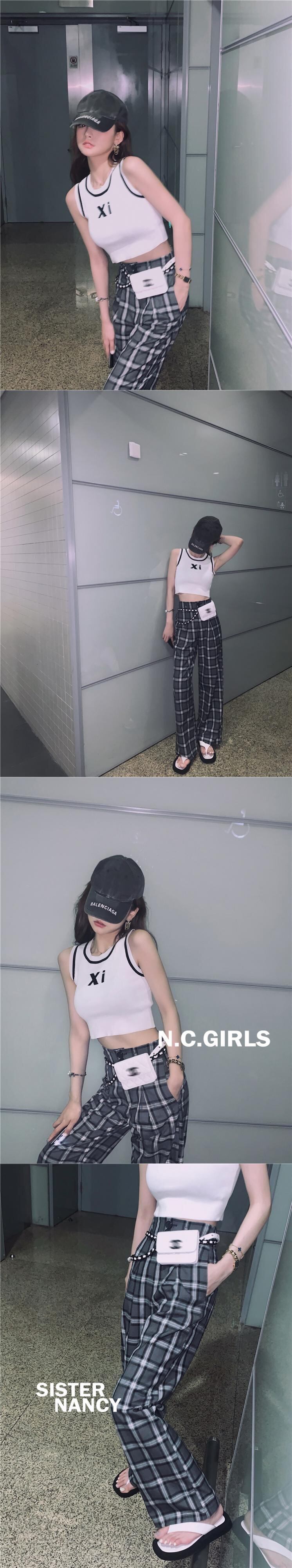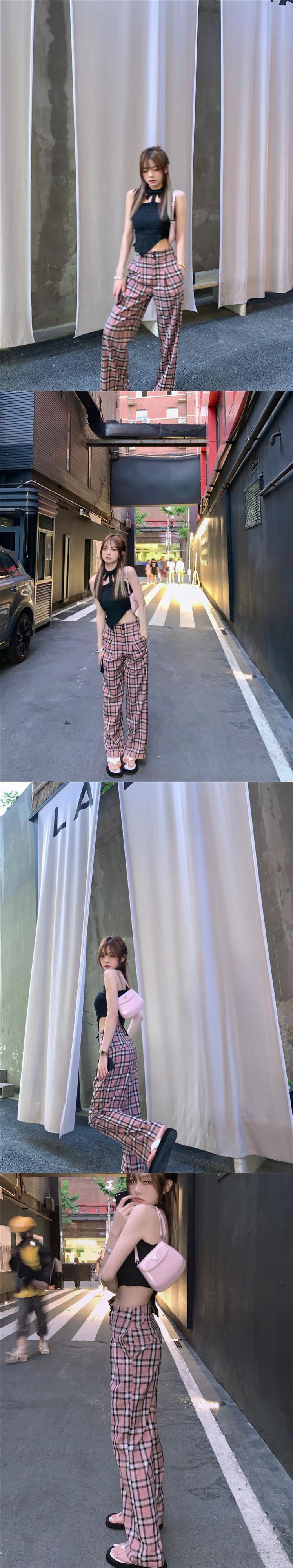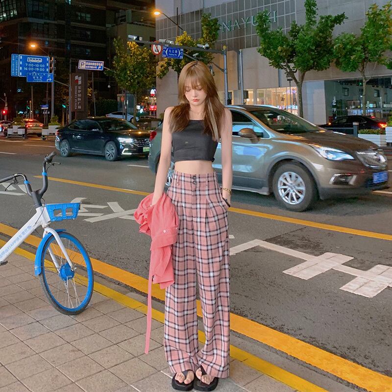 シスターナンシーカジュアルチェック柄パンツレディース夏薄ハイウエストドレープストレートレッグパンツルーズワイドレッグモップパンツ s2812117722085189