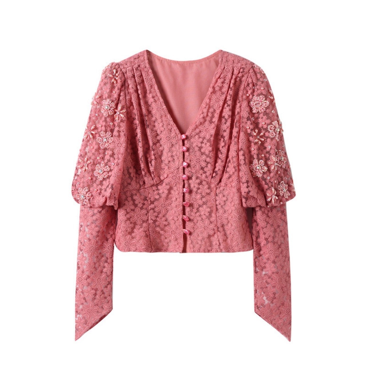 南西姉妹手作り高精細フルガーデン春パフスリーブビーズトップス2021年春夏新セクシーシフォンシャツ s2812129514655157