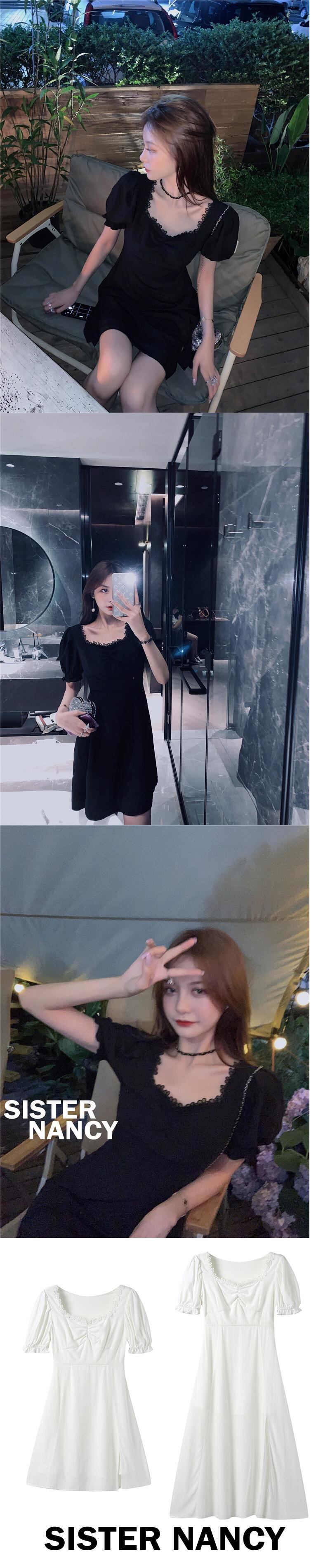 南西姉妹カスタムレーススクエアカラードレス女性2021年夏の新しいハイウエストパフスリーブ気質ロングスカート s281211702258295