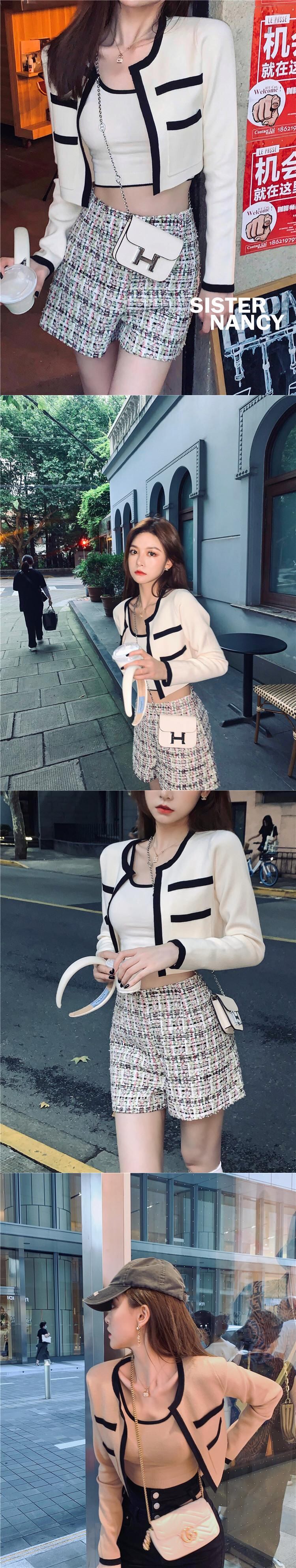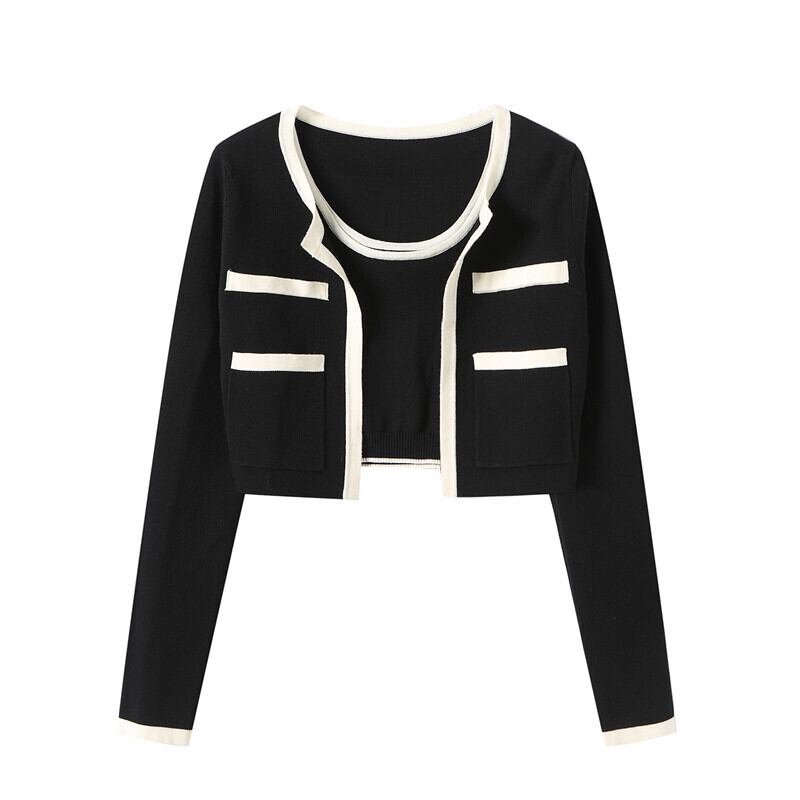 南西姉妹コントラストカラーニットカーディガンジャケット女性2021年秋新作キャミソールショートジャケットツーピーススーツ s2812115567345114