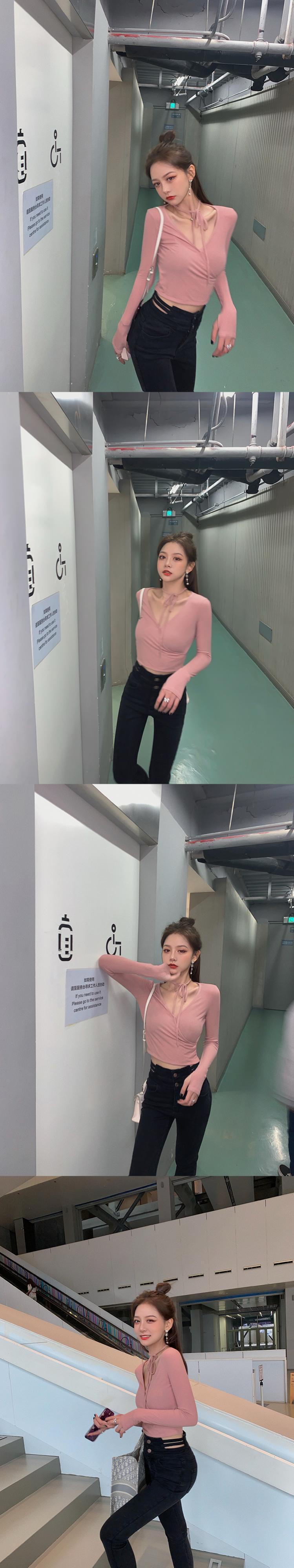 南西姉妹カスタム黒Tシャツ女性長袖2021年秋の新しいスリムで薄いVネックタイトフィットボトミングシャツ s2812150251457761