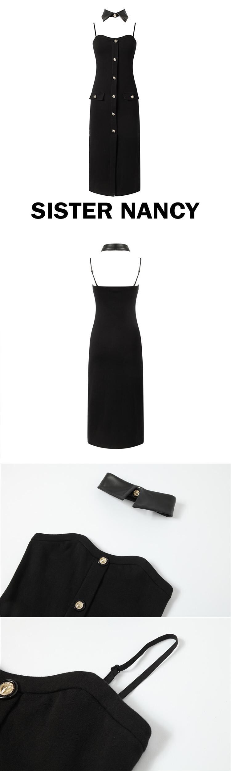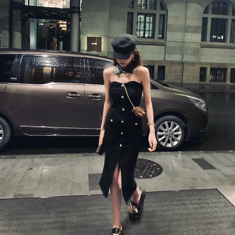 南西姉妹黒ホルターネックスクエアネックチューブトップドレス女性2021年秋新しいウエストと薄いヒップスカート s28121924505931