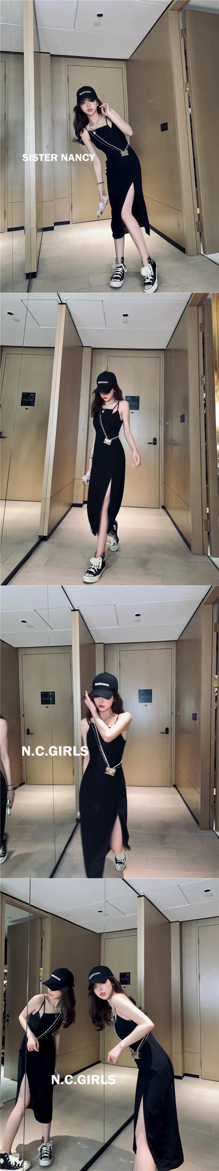 姉妹南西ノースリーブ背中の開いたセクシーな花柄ドレス2021春/夏黒スリムストラップスプリットドレス s2812188805970767