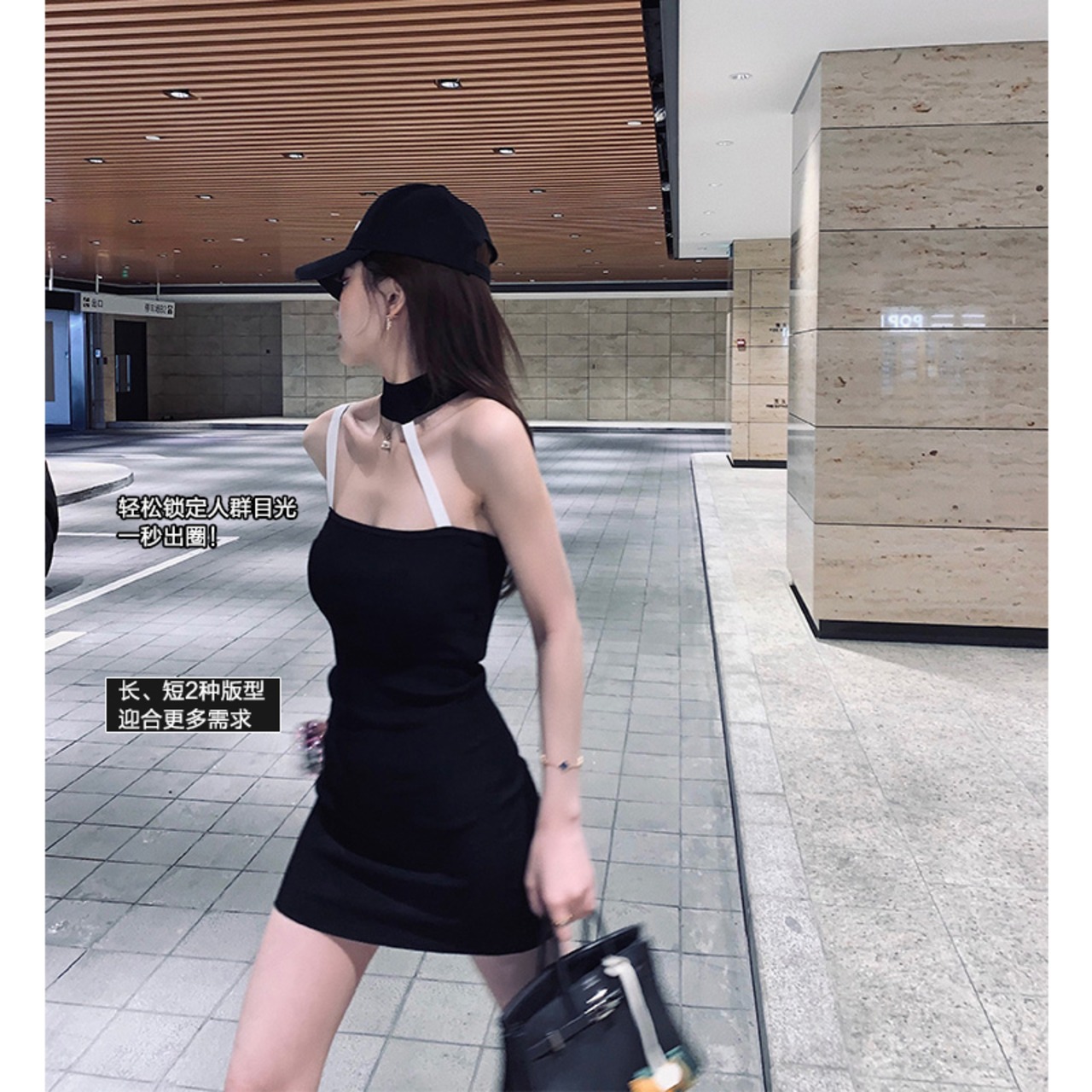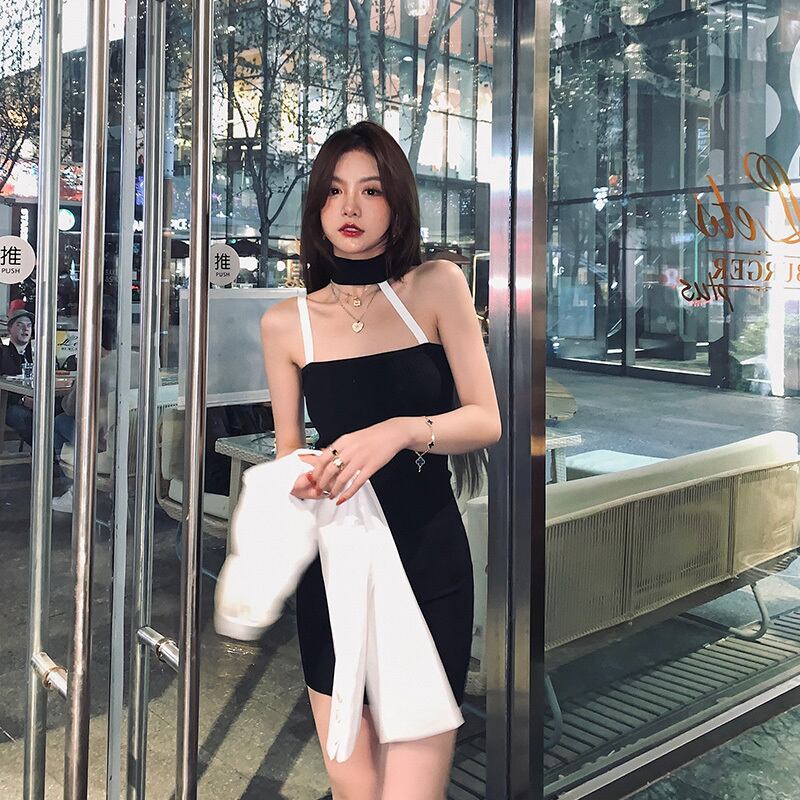 NanXiの姉妹ホルターネックニットサスペンダースカートの長さと短いセクション2021夏の新しい黒のデザインセンスニッチドレス s2812124233866332