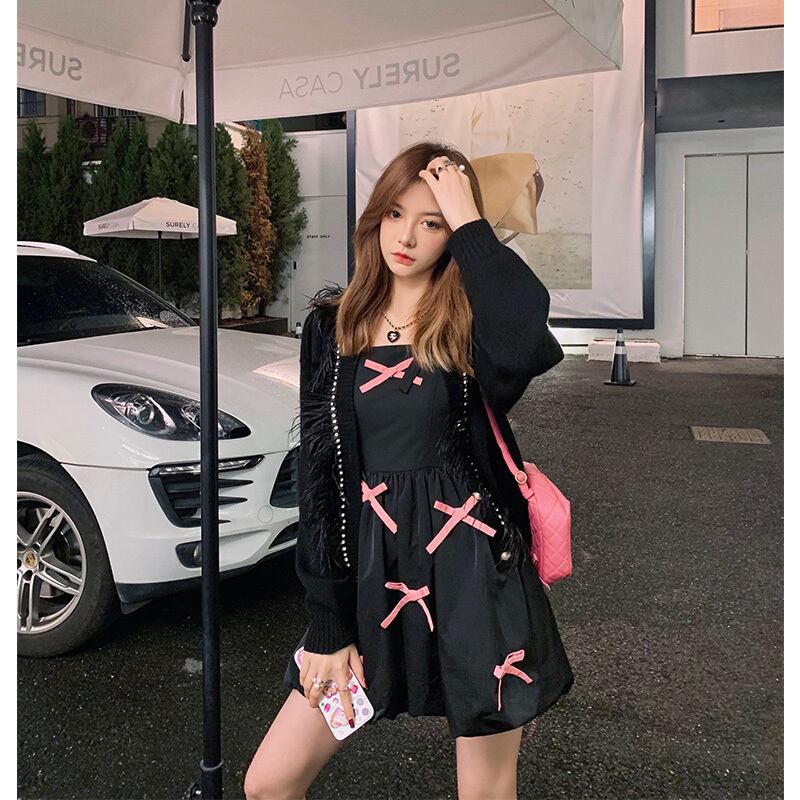 南西姉妹の自家製ボウノットスクエアネックサスペンダードレス女性初秋2021新しいウエストスリムショートスカート s281218053357832
