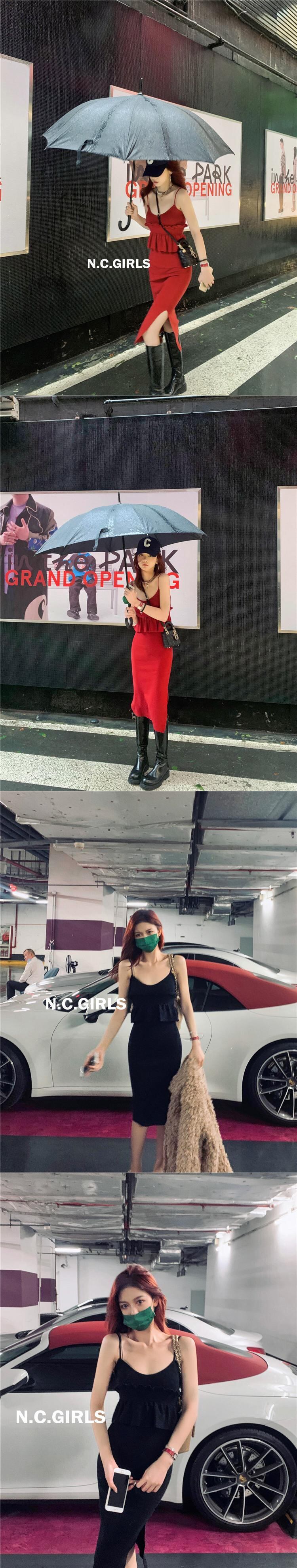 シスターナンシー2021秋の新しいスタイルの赤いVネックスリムスリムドレス、アガリックエッジニットサスペンダースカート s2812185898815024