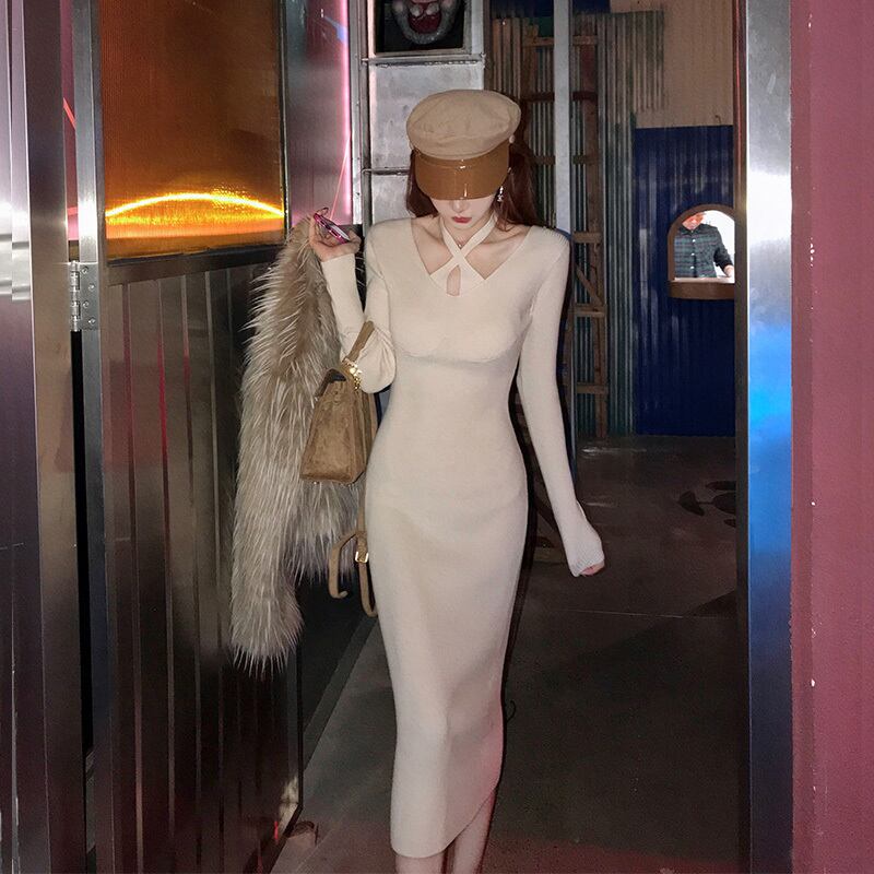 シスターナンシーのスモールウエストファインフェイクツーピースニットドレスレディース2021年新作Vネックスリムスリムボトミングロングスカート s2812151598175894