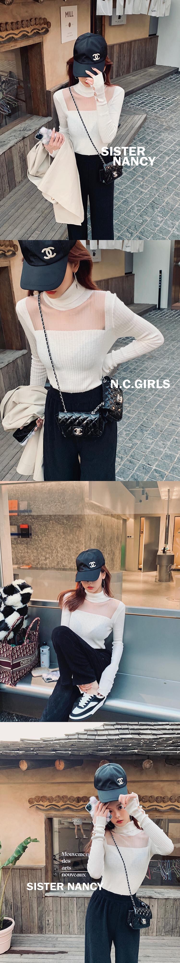 シスターナンシーの高度な漁網糸ボトミングシャツ女性の2021年秋冬の新しい純粋な欲望ハイカラースリムトップ s281217839044360