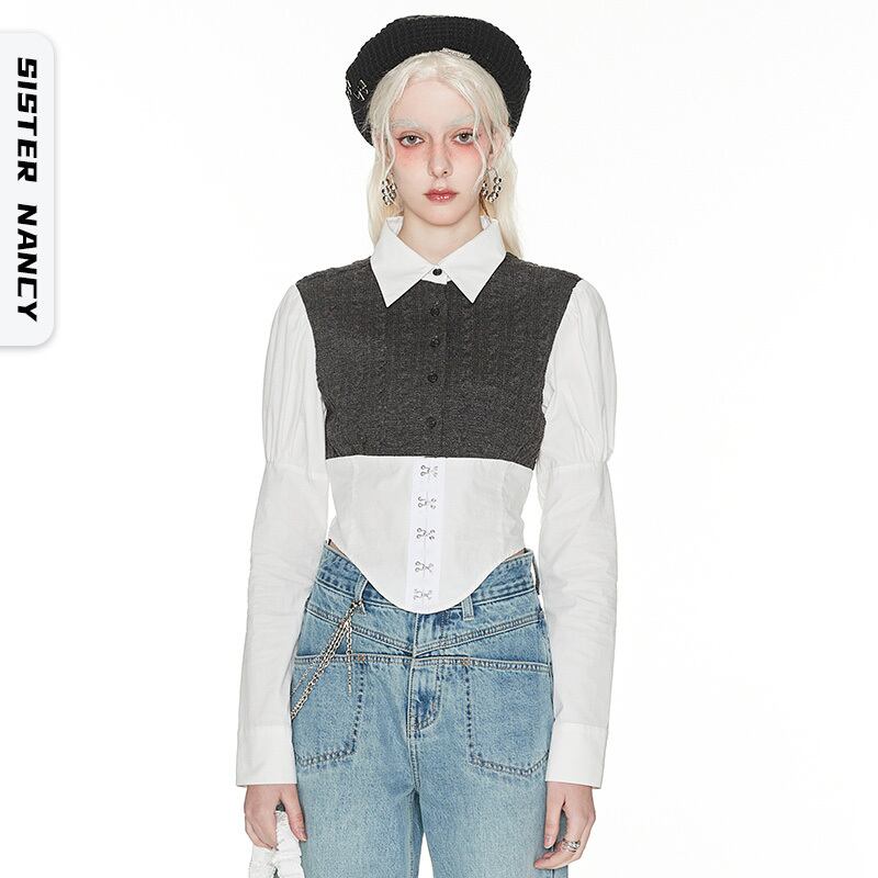 シスターナンシー3.4「ビビアン」ショートシャツスタイルのトップ、2つのフェイクステッチセーター、スーパーA s2812151643624707