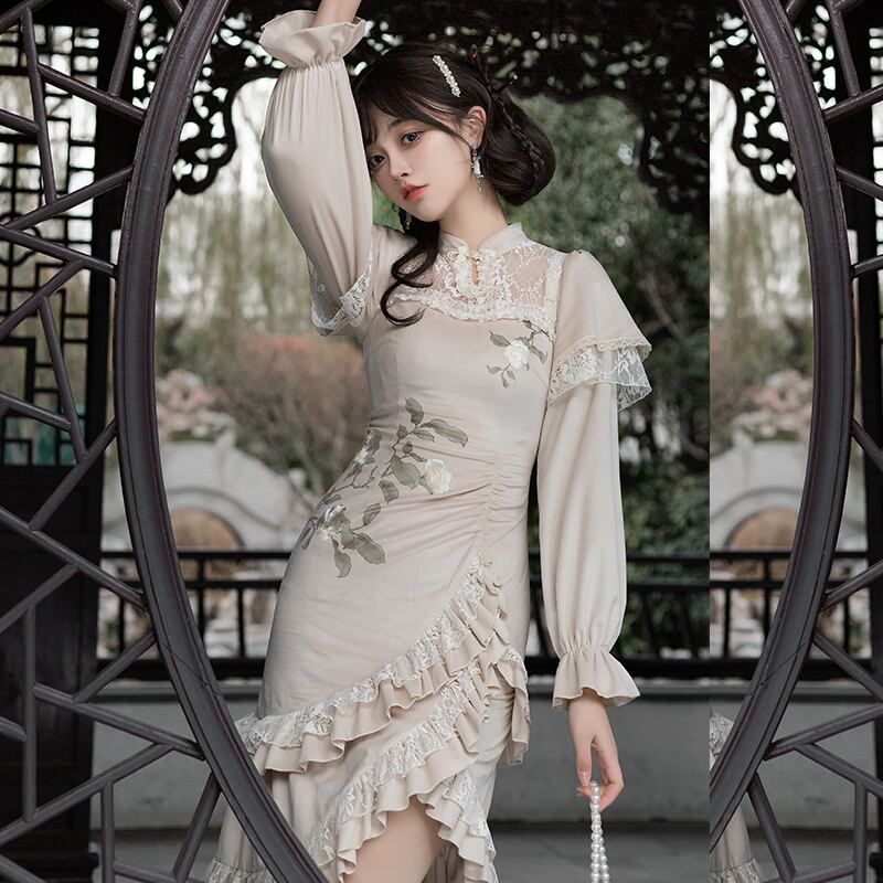 [揚げ雪op] WPオリジナルデザインエレガントな刺繍プリントベルベット中国風マーメイドスカート改良チャイナドレスロー春 レッド スプリング 春物 puji45446158892