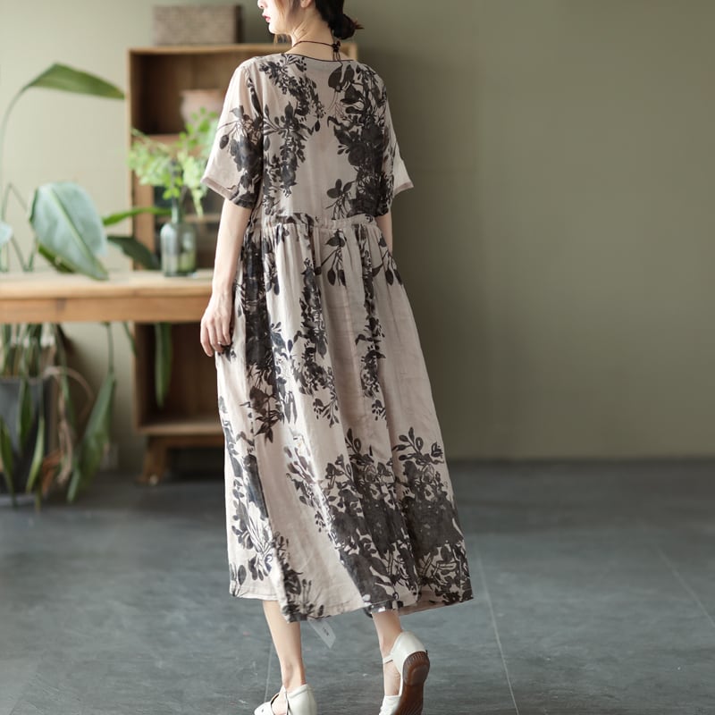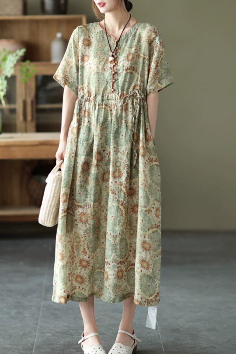 レースアップウエストコットンリネンドレス夏の新しい緩い大きいサイズのレトロな気質プリントライトリネンミドル丈スカート 大きめサイズ サマー 夏物 sine35781431274