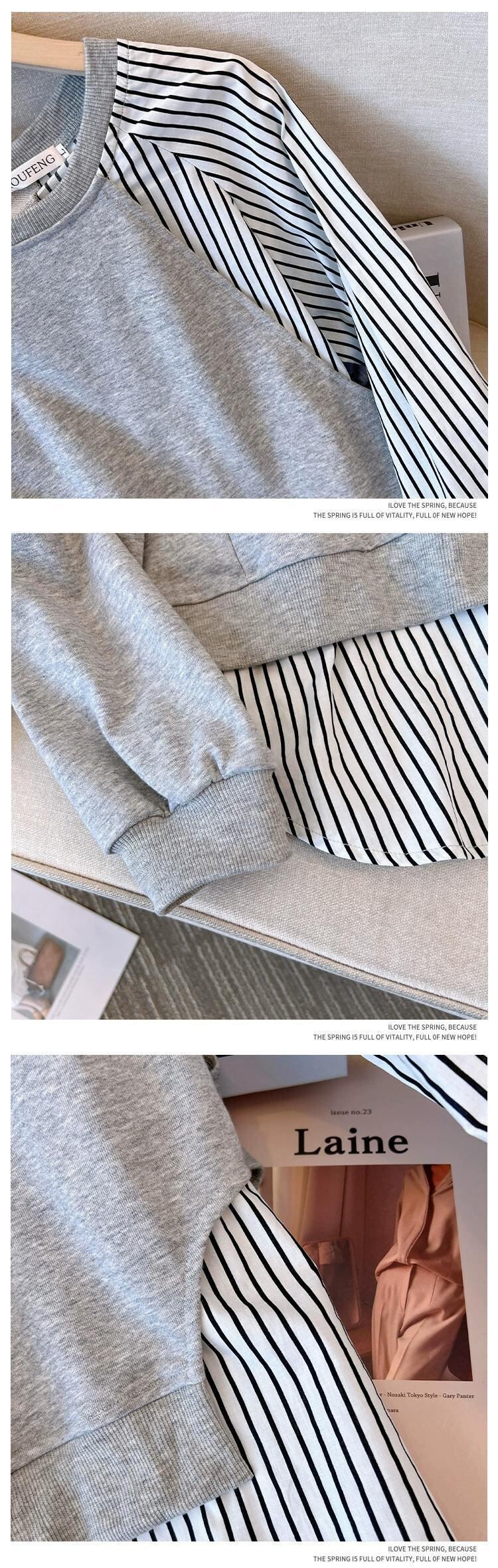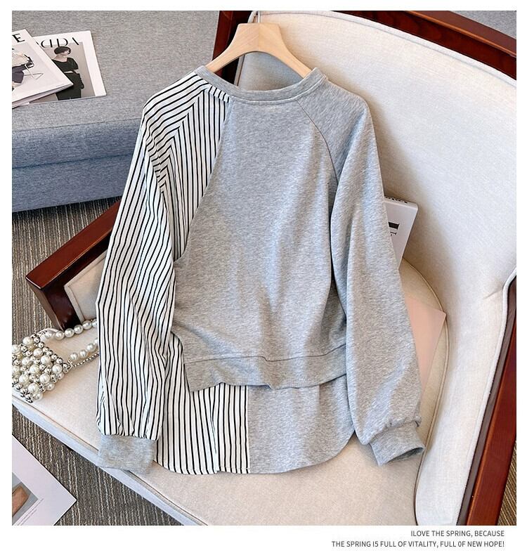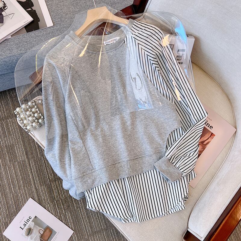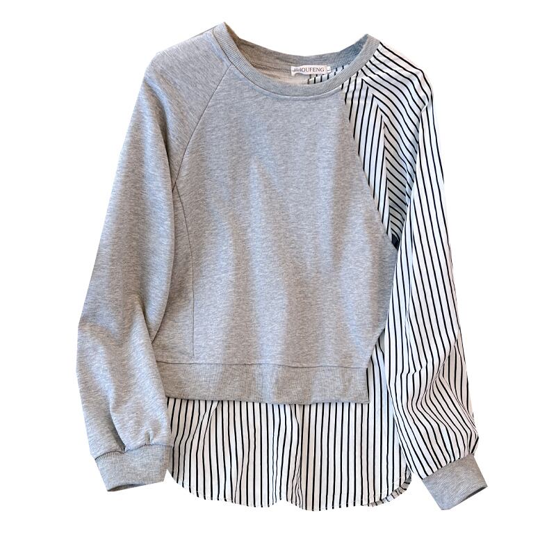 カウンター除去クリアランス最終在庫レディース大きいサイズフェイクツーピースプルオーバートップルーズ痩身ストライプ長袖スウェットシャツ ロング 大きめサイズ sine79565423856