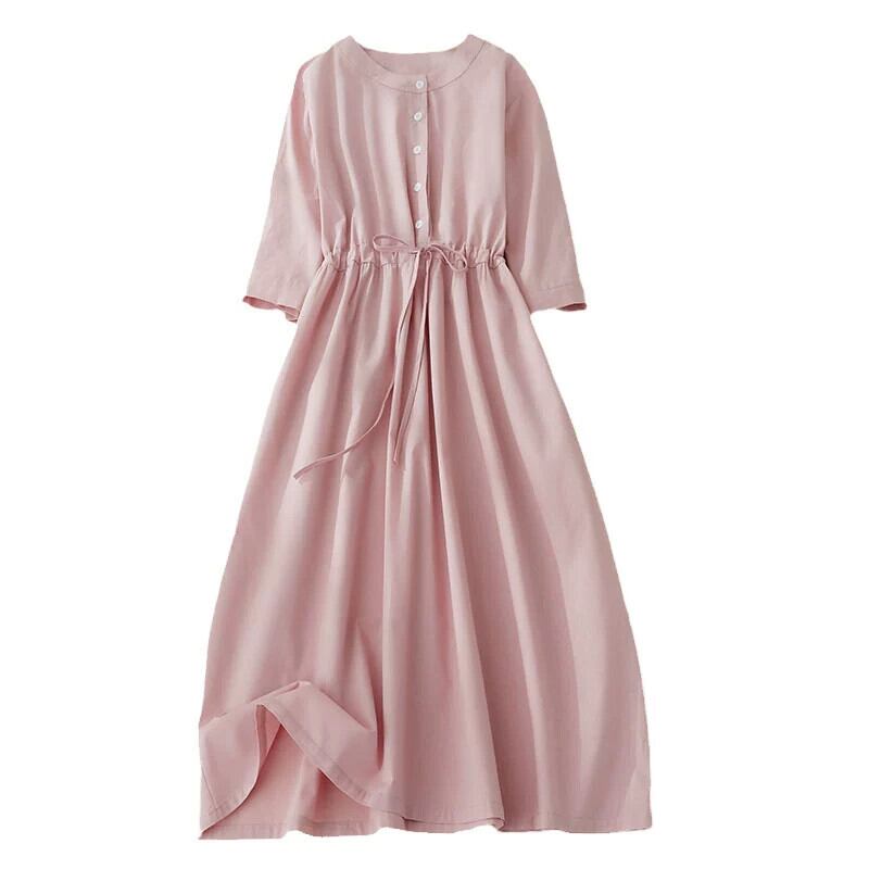 永貿易輸出ビッグブランド尾品撤退女性の文学綿とリネンのドレスウエストネクタイリネン七分袖シャツドレス コットン sine88378497350