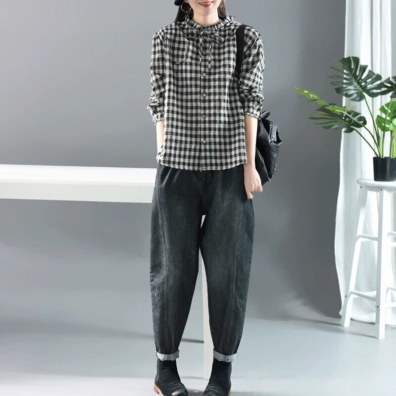 レトロなプラスサイズの女性の綿とリネン長袖シャツ春ルーズと西洋スタイルのチェック柄菌襟ネクタイカジュアルリネントップ ロング コットン 大きめサイズ スプリング 春物 sine50691033748