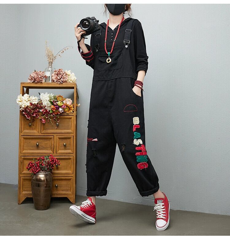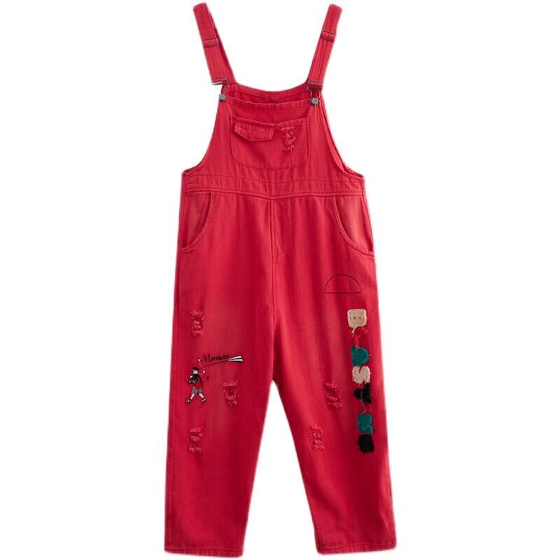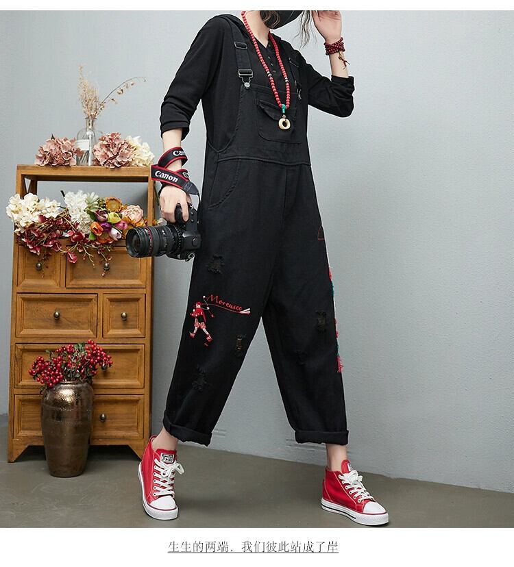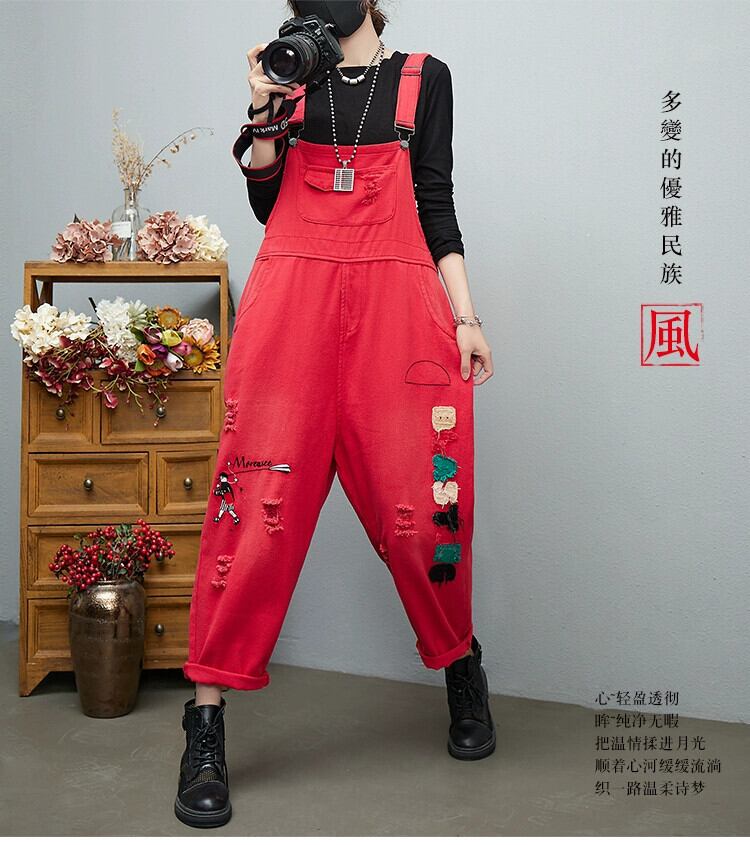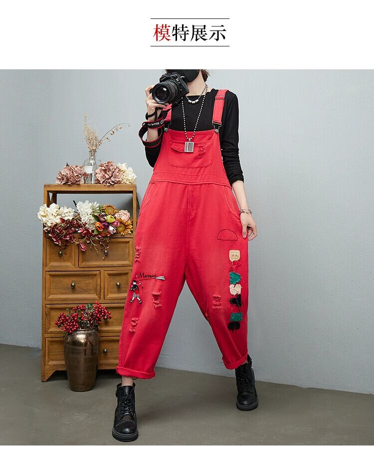 ファットシスターデニムオーバーオール女性の春 2022 夏ルーズ大きいサイズレトロ刺繍コントラストカラーリッピングハーレムパンツ 大きめサイズ スプリング 春物 サマー 夏物 sine80998713716