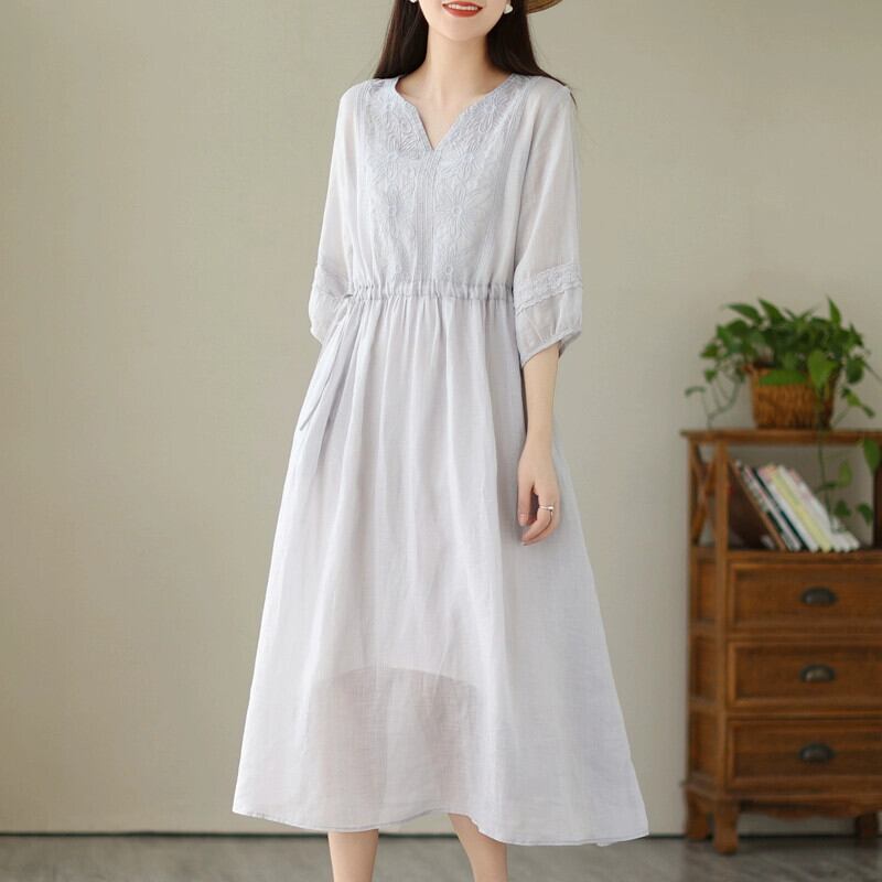 ファーストラインブランド eign trade 最終在庫レースラミー V ネックドレスレディースルーズウエスト綿麻ロングスカート コットン Vネック sine6700856079