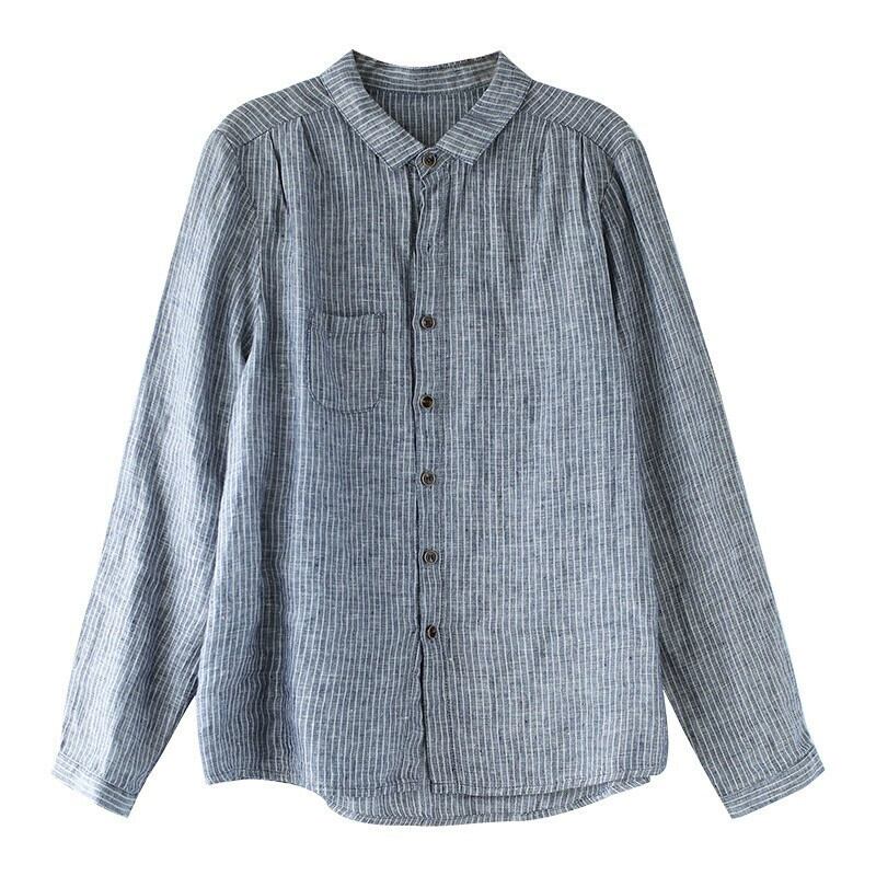 Eign Trade Counter ブランド テール グッズ レディース レトロ ストライプ コットンとリネン カーディガン トップ 文学 カジュアル リネン 長袖シャツ ロング sine14889545999