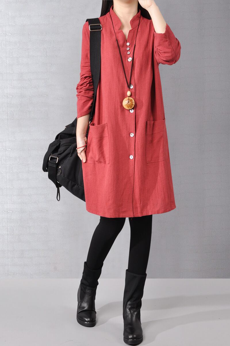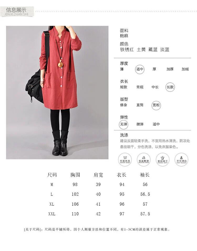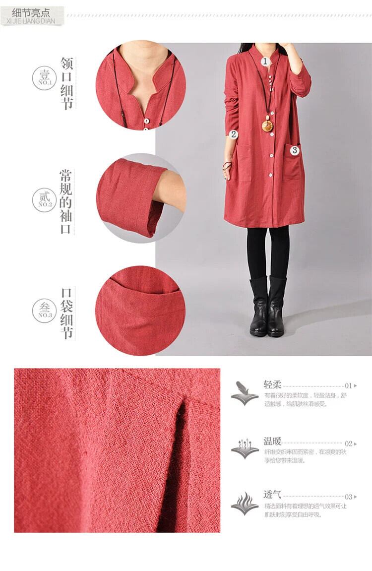 コットンとリネンのドレスの女性の新しい春と秋のゆったりとした大きいサイズのスタンドカラースリムカジュアル長袖ミドル丈リネンシャツドレス ロング 大きめサイズ スプリング 春物 オータム 秋物 sine16414853444
