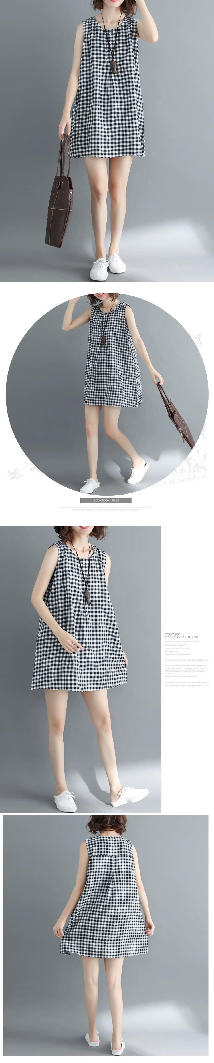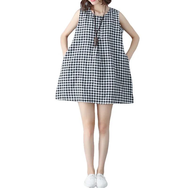 プラスサイズの女性の綿とリネンのベストドレス夏ルーズファットウエスタンスタイルチェック柄ミッドスカートカジュアルノースリーブドレス コットン 大きめサイズ サマー 夏物 sine67000042213
