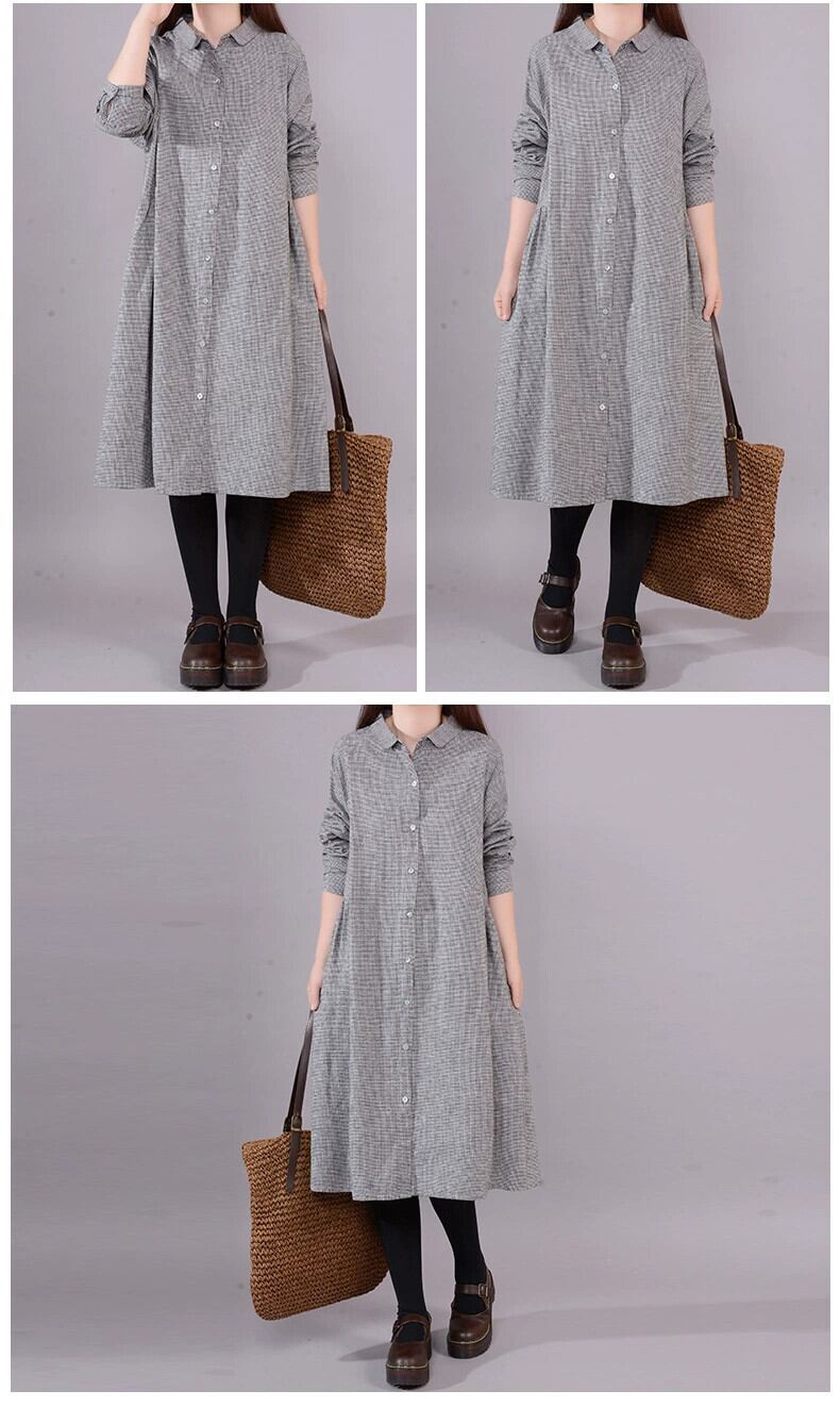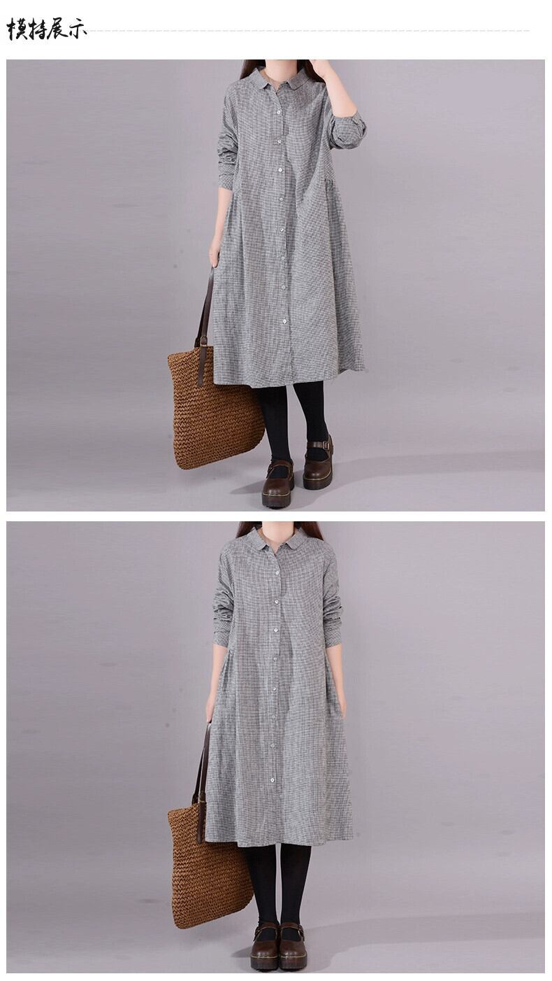綿麻ワンピース 2021 秋冬ゆったり大きいサイズスタイル細かいチェック柄ラペルミドル丈リネン長袖シャツワンピース ロング コットン 大きめサイズ オータム 秋物 ウィンター 冬物 sine21306016142