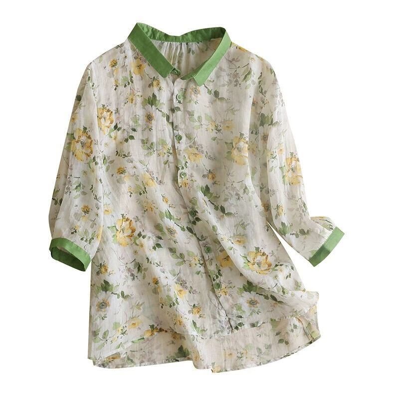 第一線ブランド eign trade 最終在庫レディース レトロ プリント コットンとリネン半袖シャツ ルーズ スリミング リネン 薄手 トップ sine25870285676
