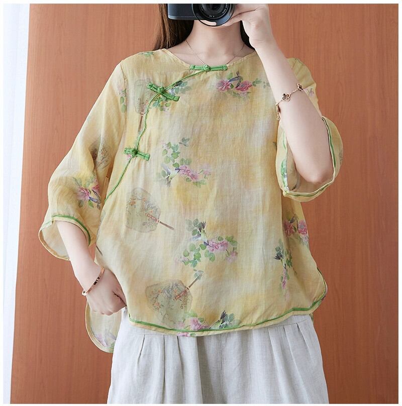 中国風斜めブレストラミーシャツ女性の 2021 夏の新しい緩い脂肪 mm 年齢を減らすレトロなプレートボタンプリントミッドスリーブトップ サマー 夏物 sine35584149644