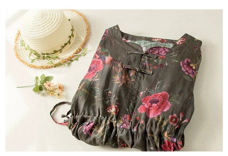 第一線ブランド eign trade 最終在庫レディース レトロ バックル プリント ラミー ロング スカート ウエスト レースアップ コットンとリネン ドレス sine99113761104