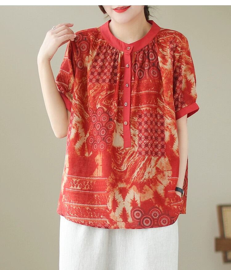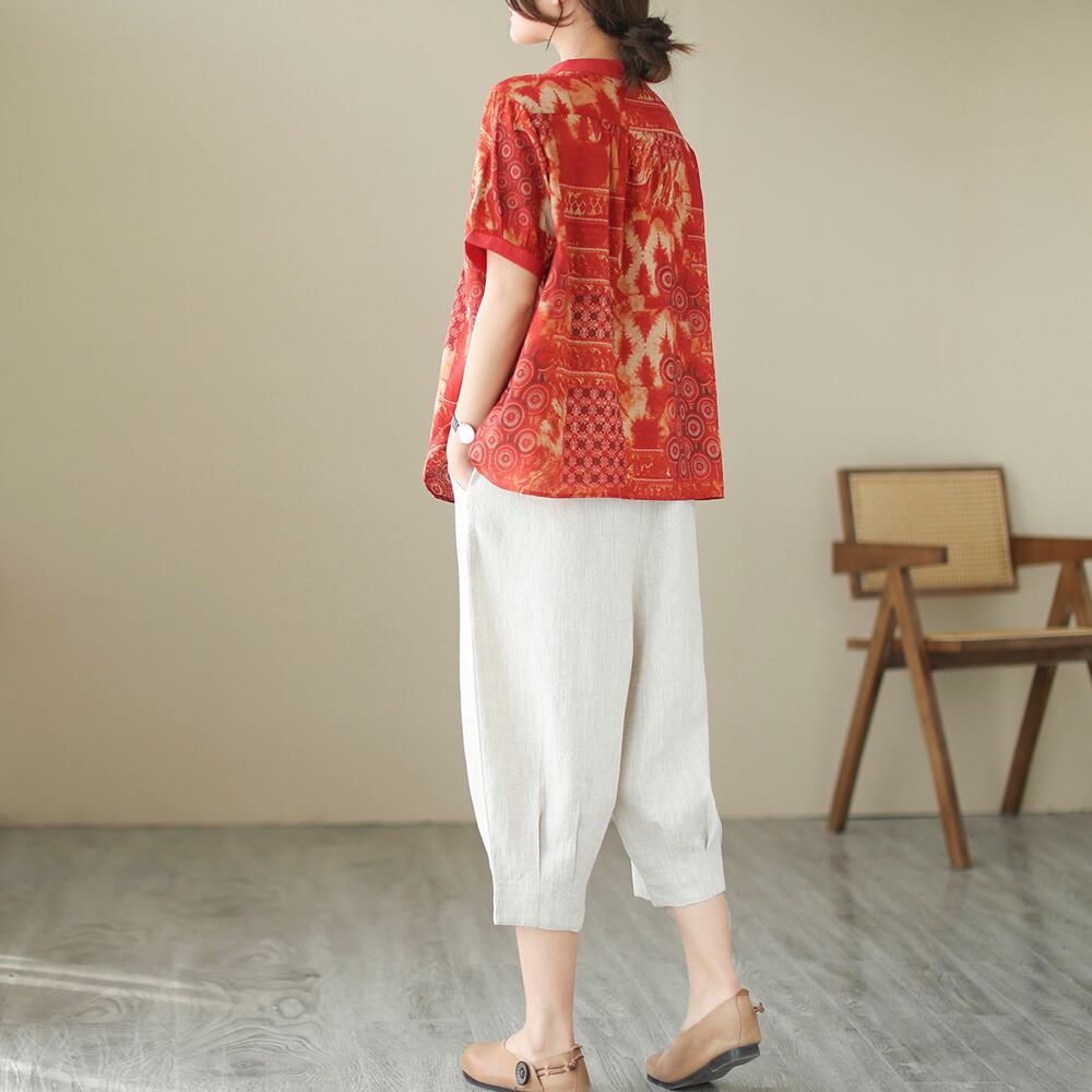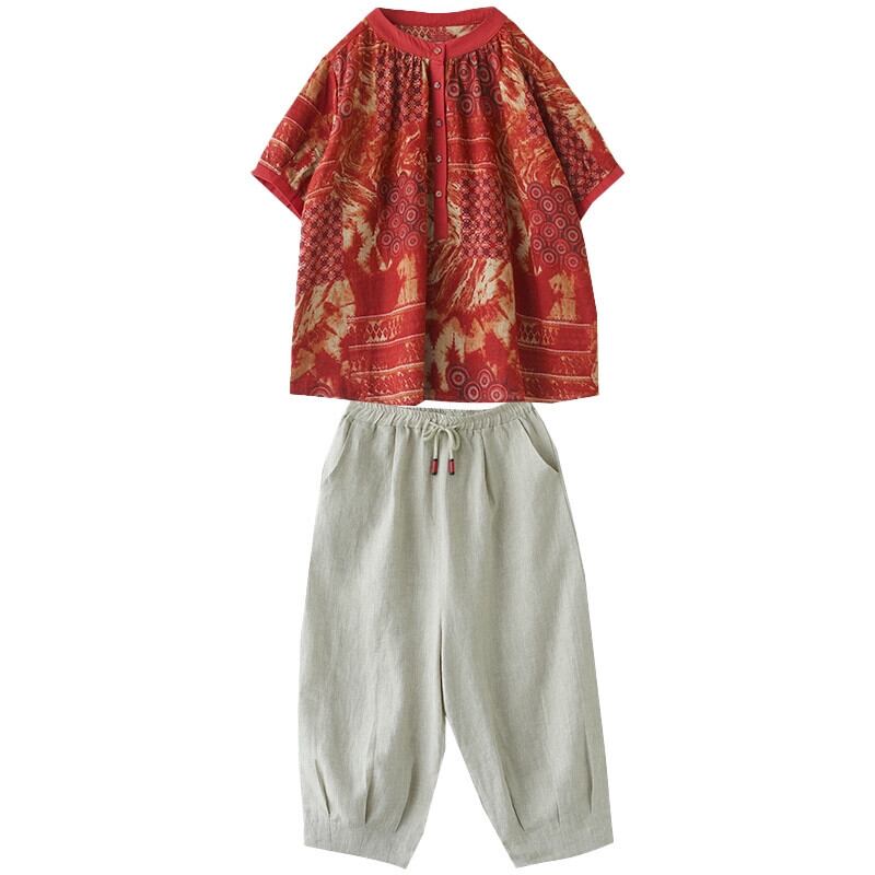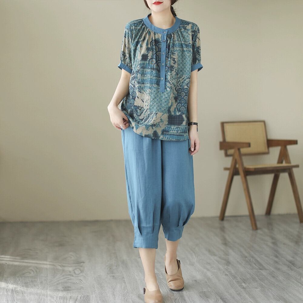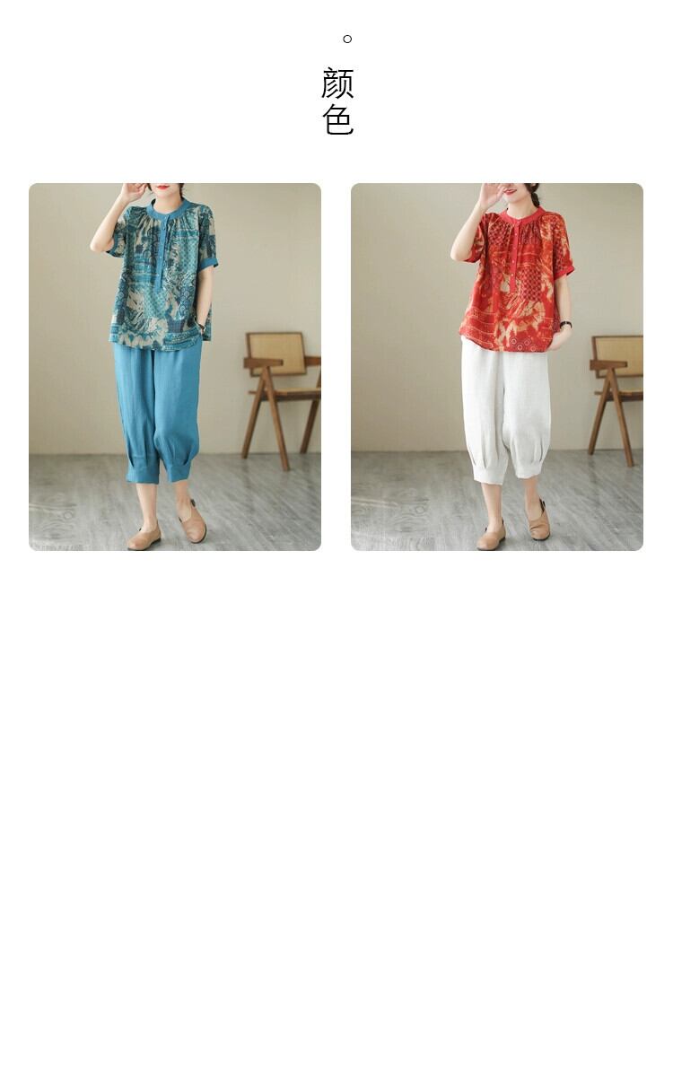 クリアランスリーク〜コットンとリネンのスーツの女性、ゆったりとしたプリントの半袖シャツトップ、カジュアルなハーレムパンツとリネンの2点セット sine93335577053