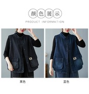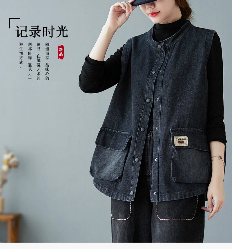 秋と冬ゆるい大きいサイズの女性のレトロなダメージ加工作業着ポケットスタンドカラーベストトップノースリーブデニムベストジャケット 大きめサイズ オータム 秋物 ウィンター 冬物 sine24586896059