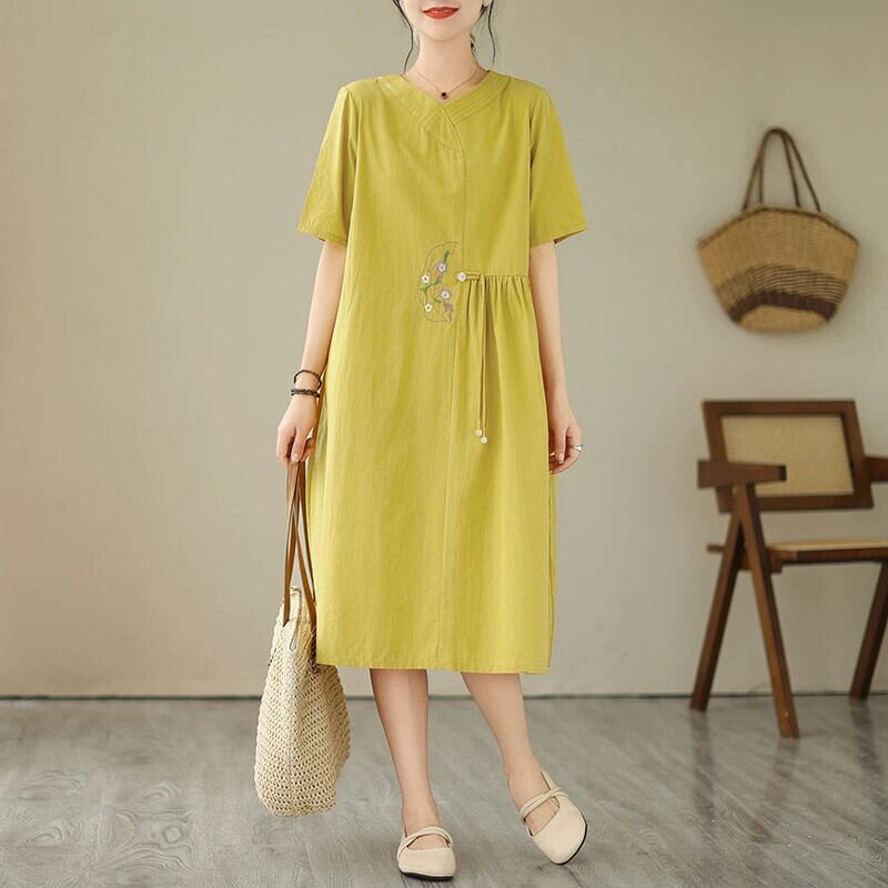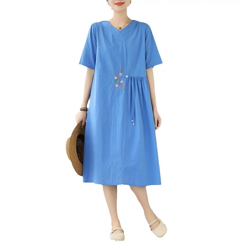 ビッグブランドテールグッズのクリアランスカウンター撤去レトロ刺繍コットンドレスレディースゆったり着痩せ半袖Aラインロングスカート レッド sine18862525770