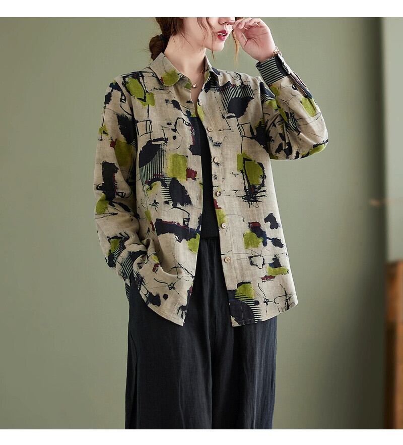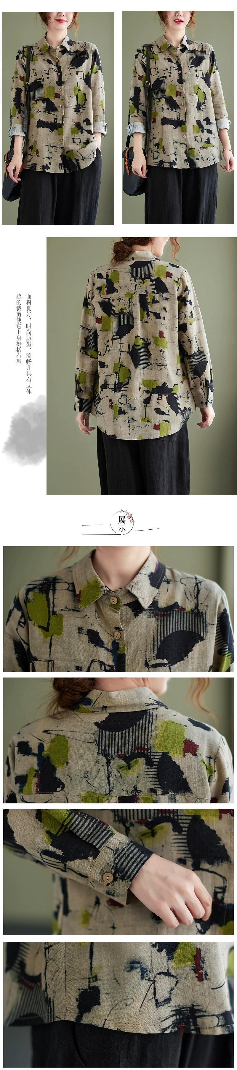 コットンとリネンの長袖シャツの女性 2021 秋の新ルーズ大きいサイズのレトロなプリント気質ラペルシングルブレストトップ ロング 大きめサイズ オータム 秋物 sine24057679741