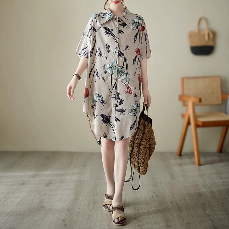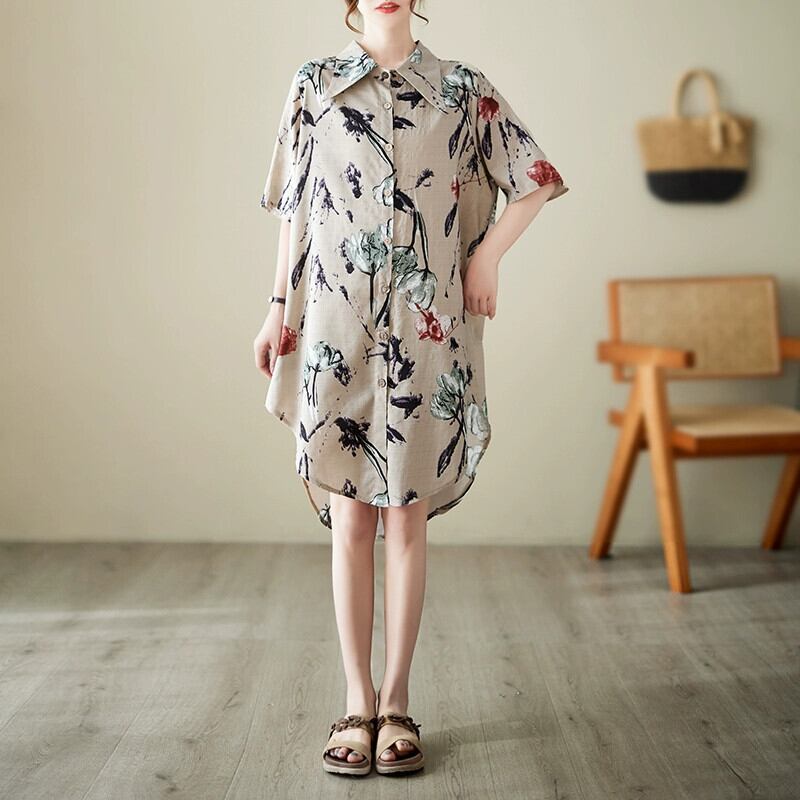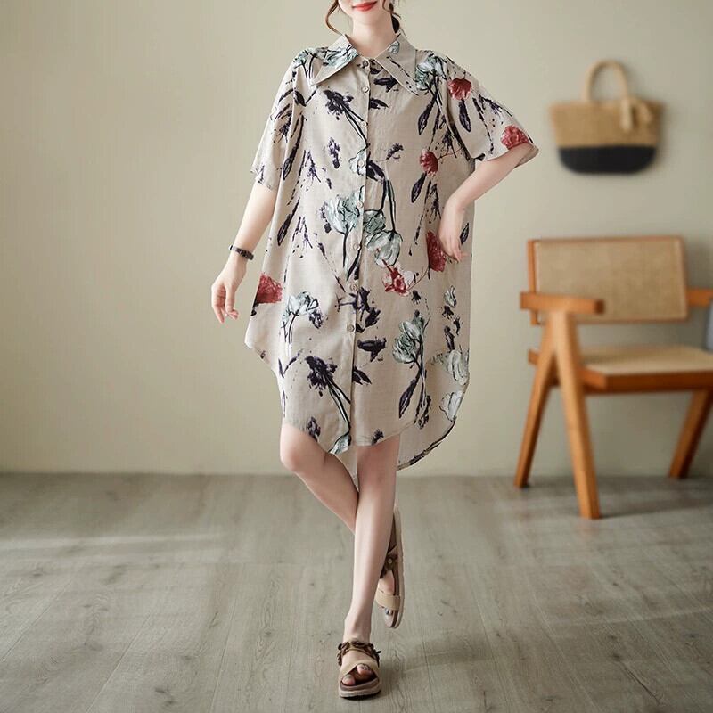 モールビッグネーム撤退最後の在庫レディースリネンプリントミッドレングスシャツスカートルーズコットンとリネン半袖シャツ夏 サマー 夏物 sine88405899057