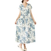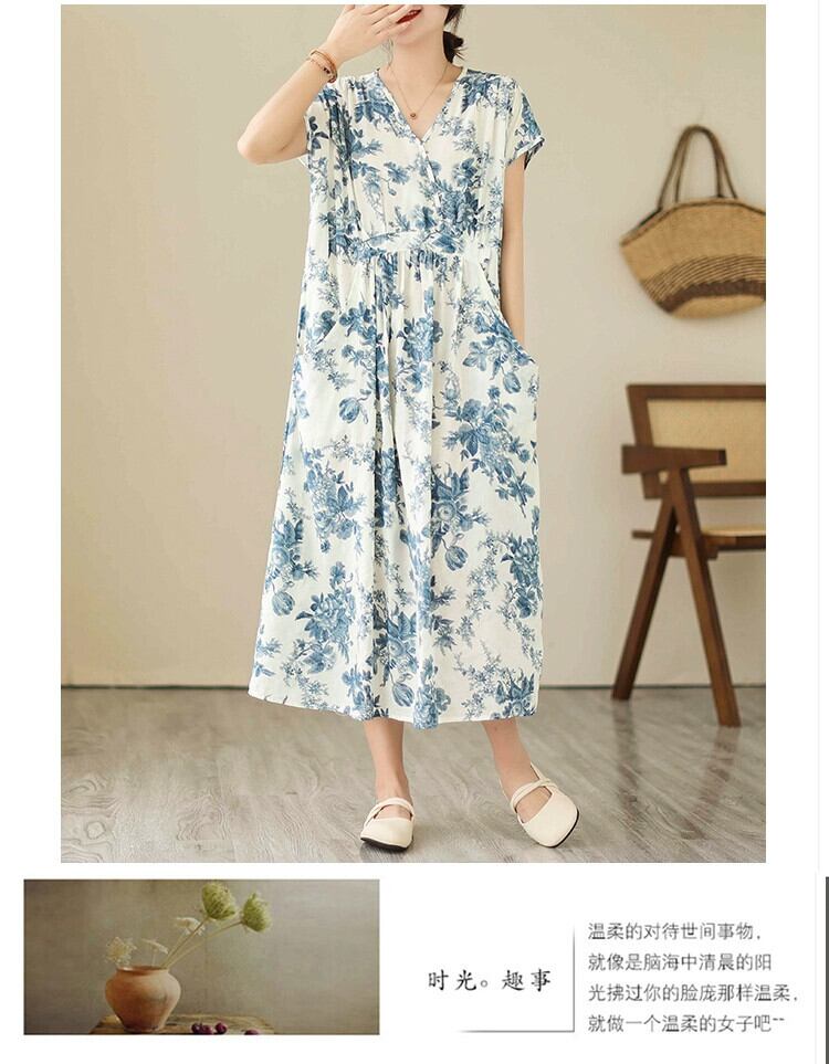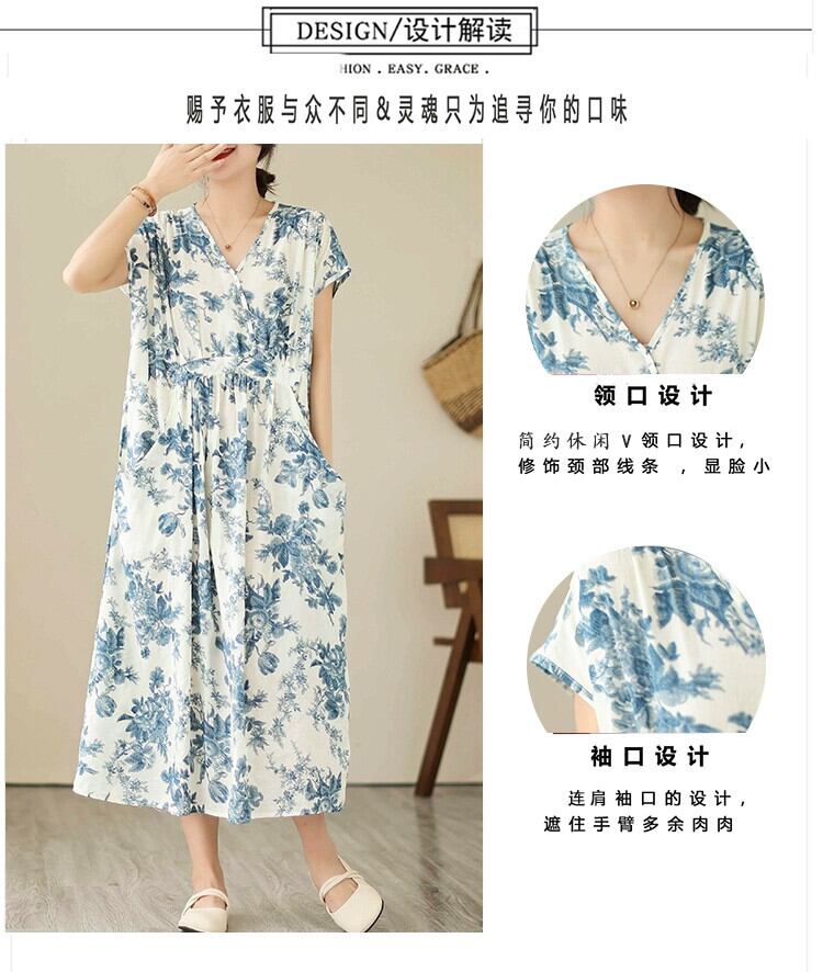エド・キャトル・クリアランス、高級テールグッズ、アーティスティックなプリントのリネンスカート、ゆったりとしたVネックのコットンとリネンの半袖ドレス sine96626356793