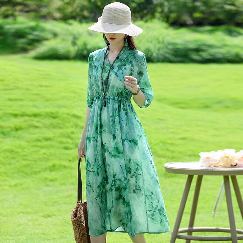 eign trade イタリアブランドテールグッズカットレーベル気質ウエストコットンリネンドレスルーズフローラルVネックラミーロングスカート 花柄 sine37872855926