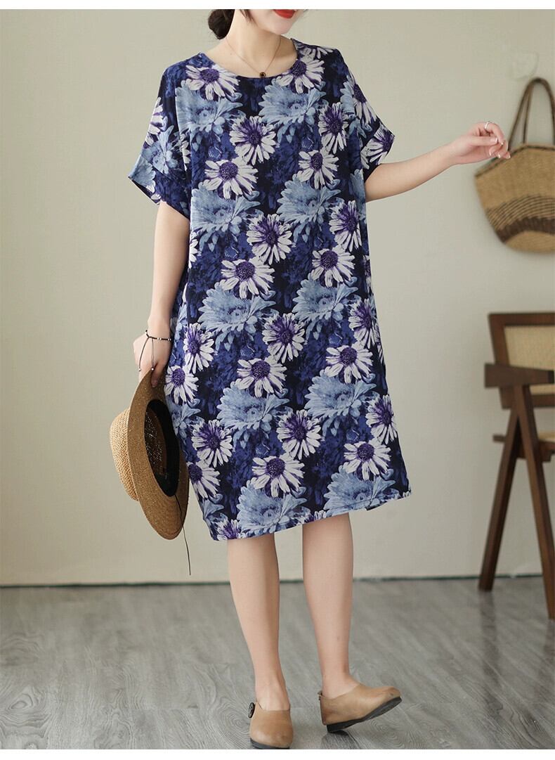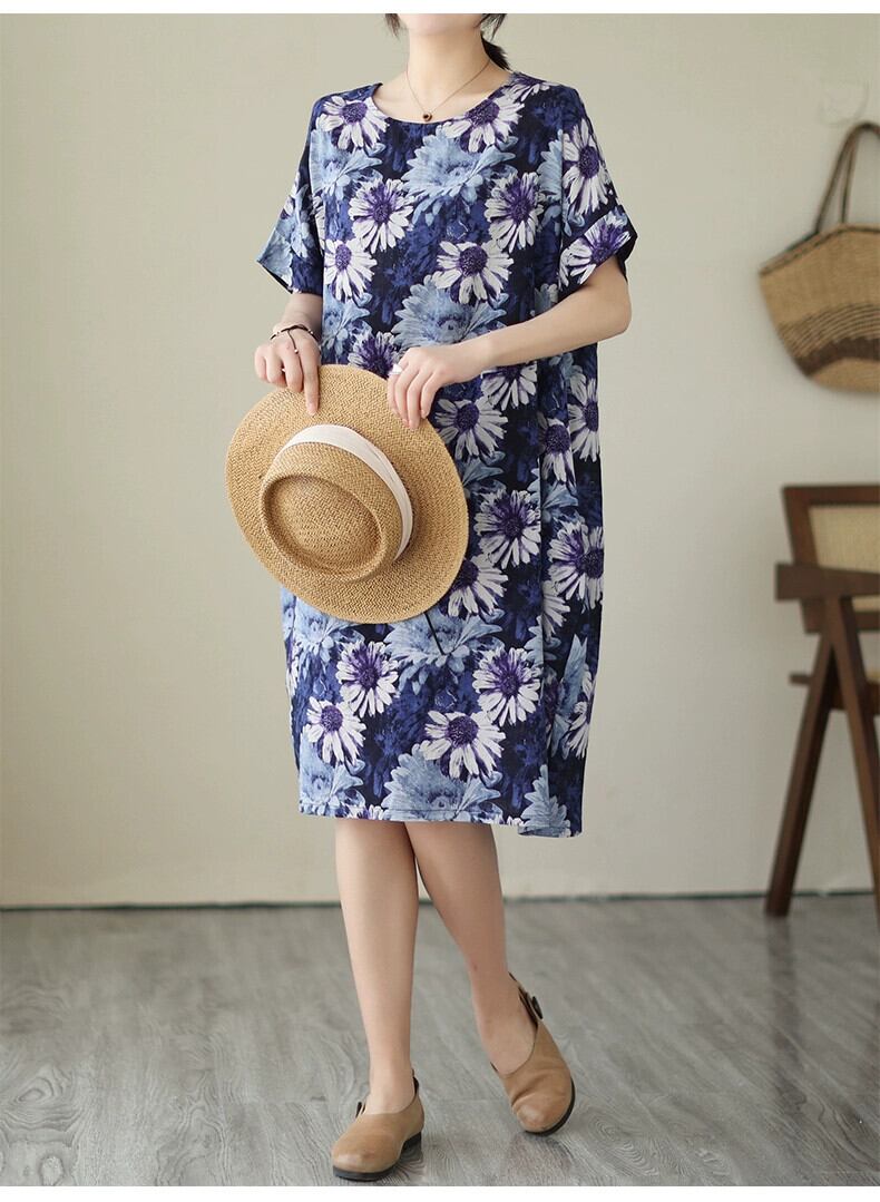 ビッグブランドテール商品のクリアランスカウンター取り外しエスニックスタイルプリント半袖ドレス女性ゆったりとした大きいサイズの綿とリネンのミドル丈スカート コットン 大きめサイズ sine68901431881