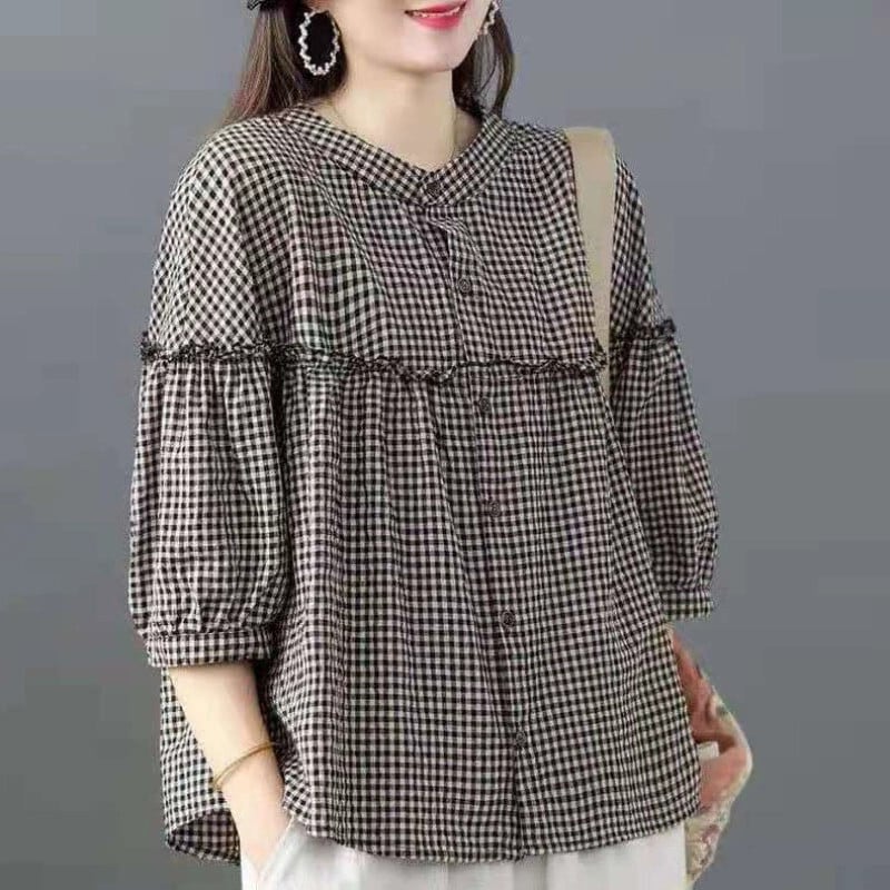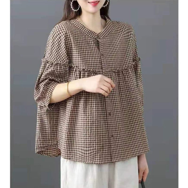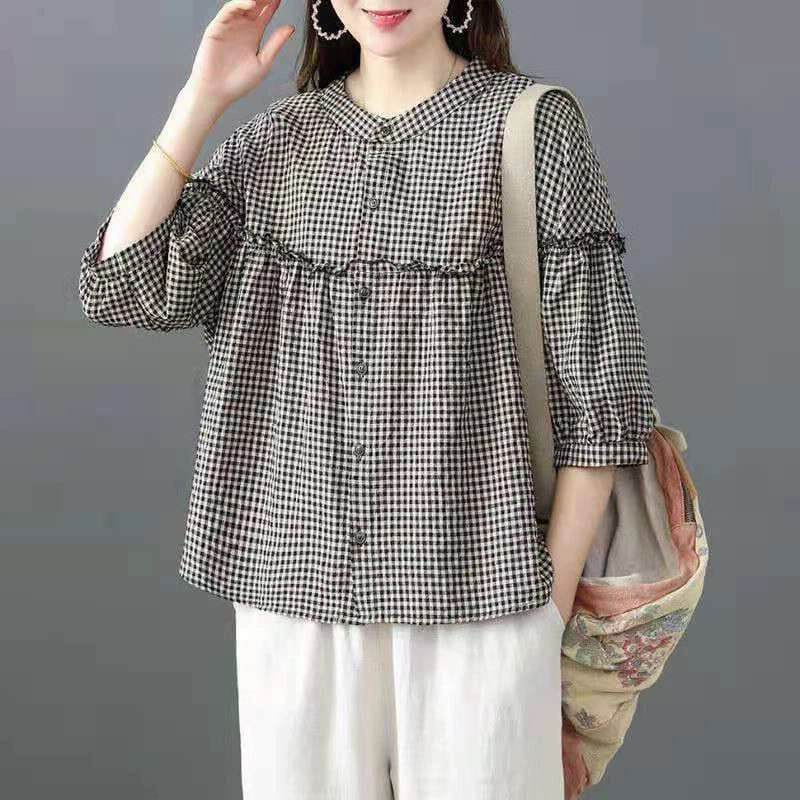 Eign Trade ese Export ラストシングル レディース クリアランス リネン 七分袖 トップ ドール セーター コットンとリネン チェック柄シャツ sine43327485152