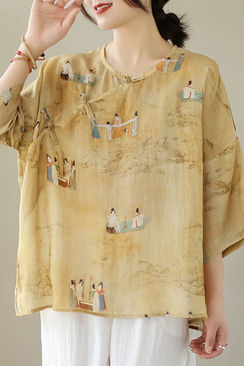 クリアランスリーク~eseオリジナルの中国風のコットンとリネンのシャツ、斜めの前立てとボタンがプリントされたティースーツのリネン半袖トップ sine42006630558