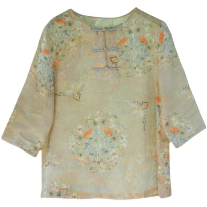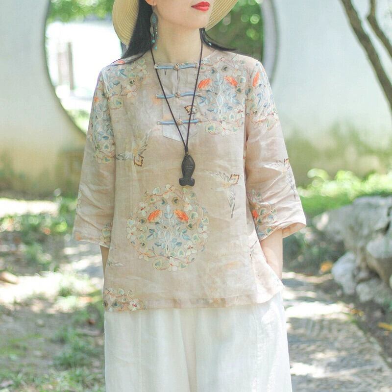 閣僚から撤退したこれらの高級ブランド永貿易独身女性の中国風ラミープリントトップコットンリネンミッドスリーブシャツ、カットオフマーク付き sine54223159806