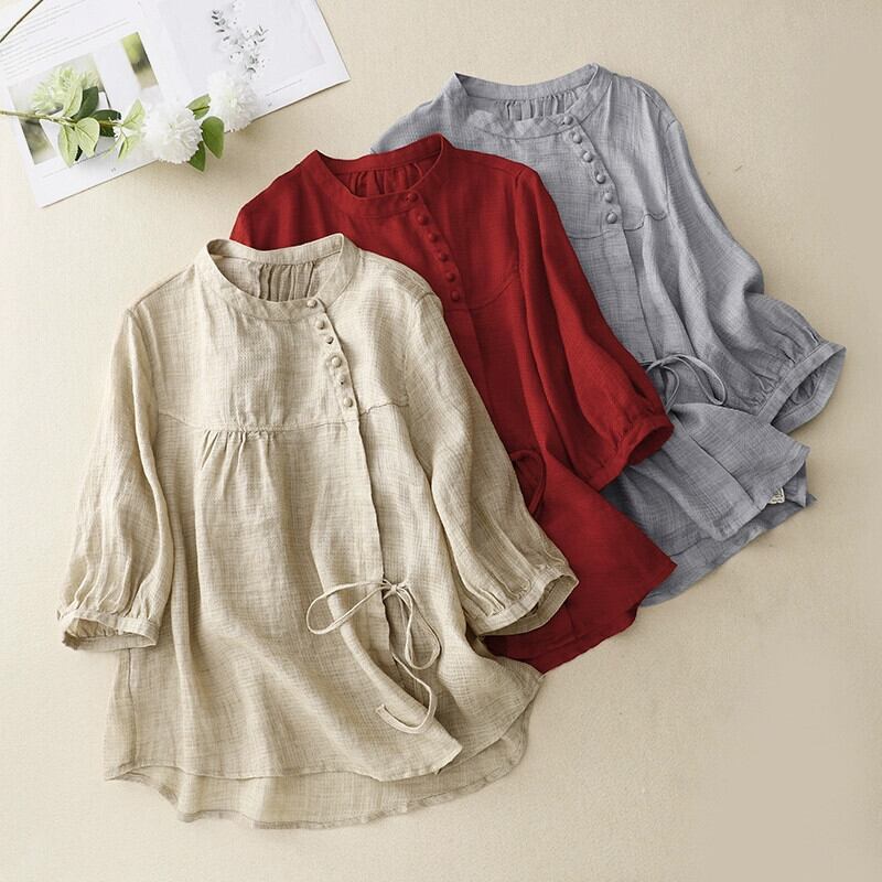 eign trade 割引ブランドテールグッズレディースレトロリネン半袖シャツ夏ルーズレースアップコットンとリネンの七分袖トップ サマー 夏物 sine41693207340