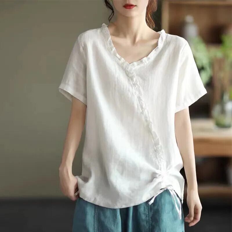 eign trade ese オリジナル シングル ビッグネーム 撤退レトロ コットンとリネン半袖 T シャツ レディース ルーズで軽いファンガス エッジ リネン トップ Tシャツ sine99146907890