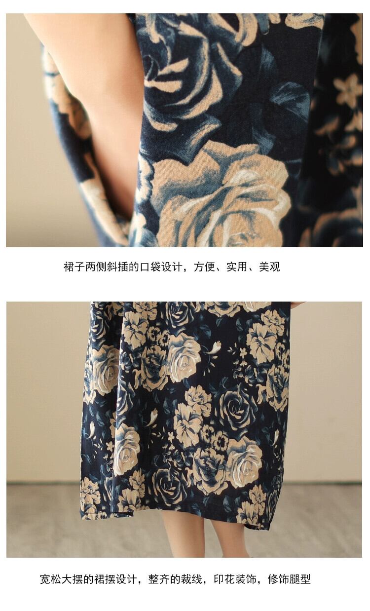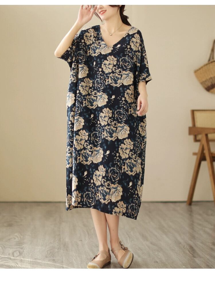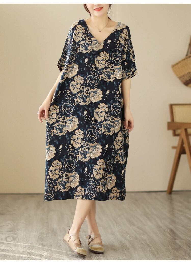 モールビッグネーム撤退最後の在庫女性のレトロプリントコットンとリネン半袖ドレス大きいサイズルーズ V ネックローブ 大きめサイズ Vネック sine37130297336
