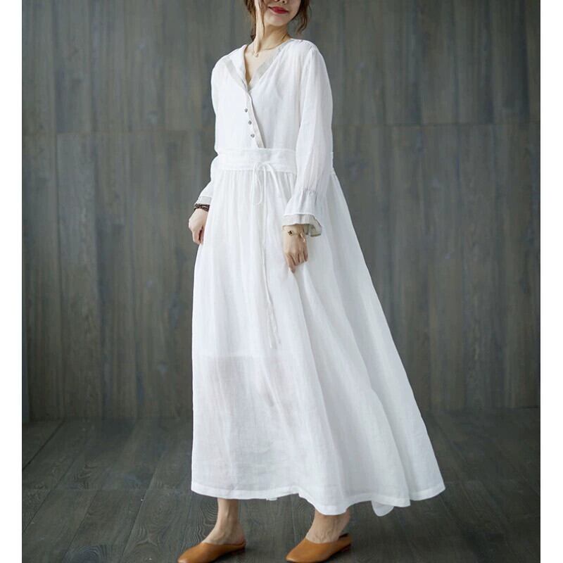 コットンとリネンのドレスの女性の秋服 2021 新しい緩い大きいサイズの気質レトロな斜めラペルデザインリネンローブロングスカート 大きめサイズ オータム 秋物 sine41278022197