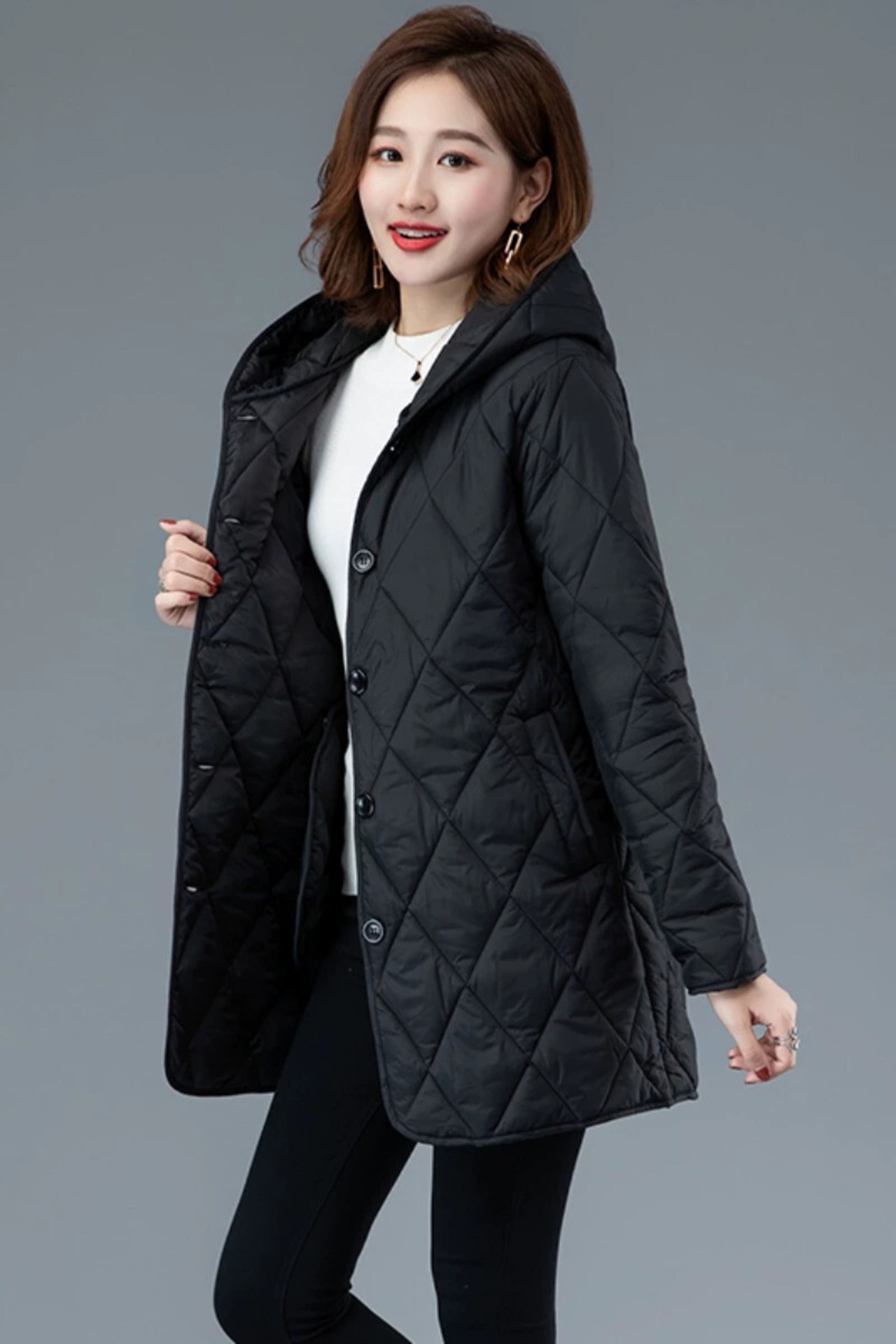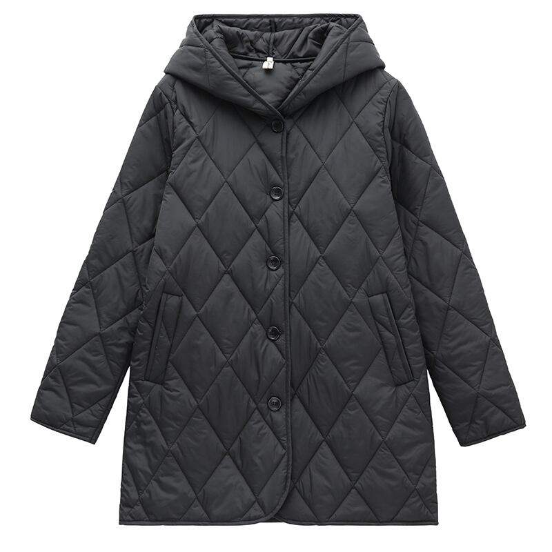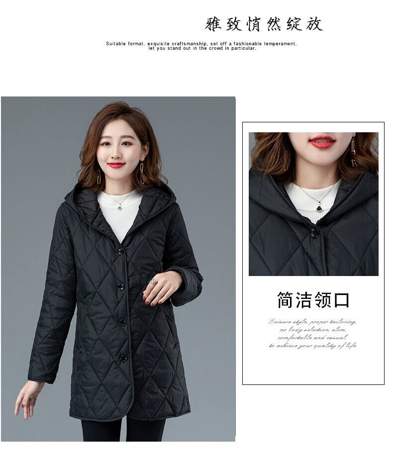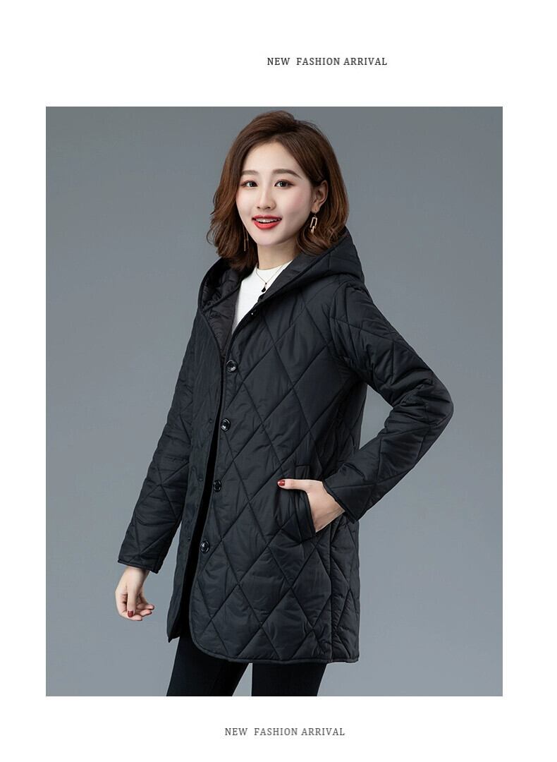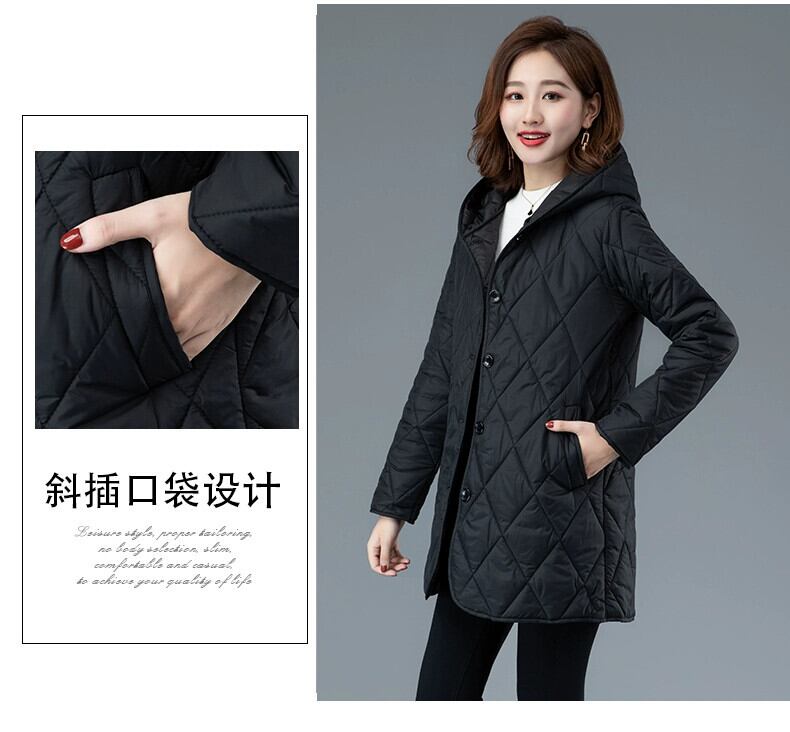秋と冬の綿コートの女性、ゆったりとした大きいサイズのスタイルの菱形キルティング肥厚ライトダウンフード付きミッドレングスの綿入りジャケット コットン 大きめサイズ オータム 秋物 ウィンター 冬物 sine29568838973