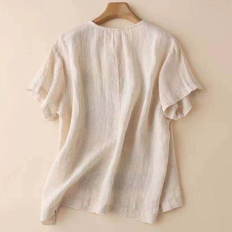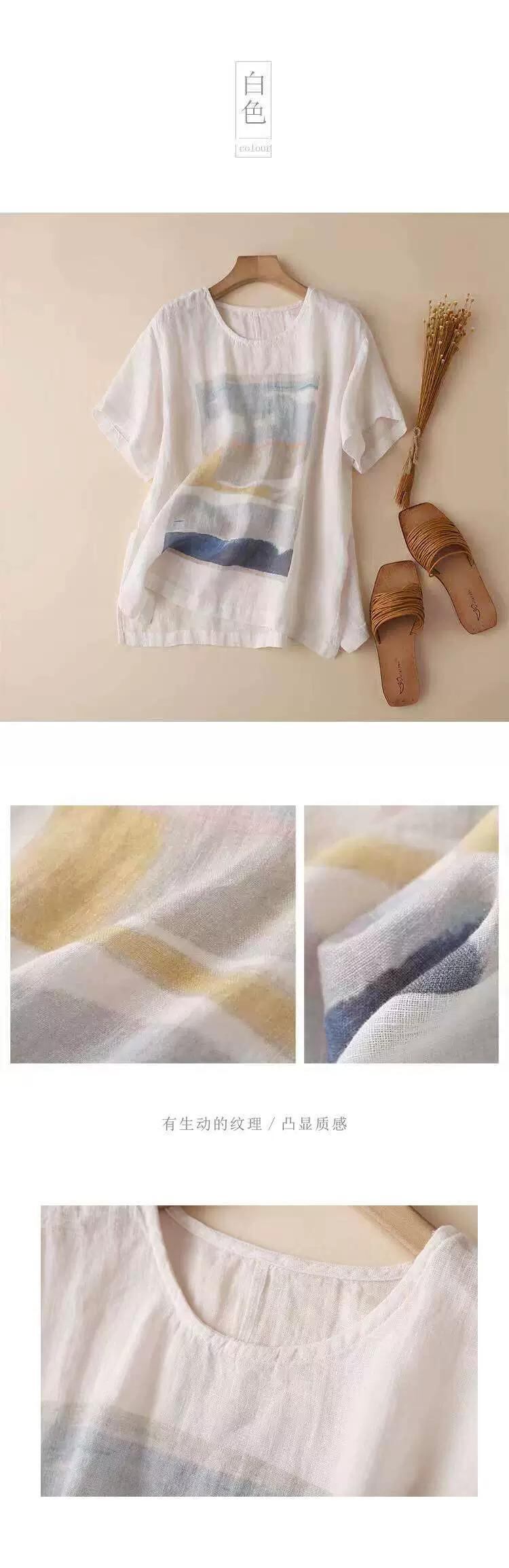 リネン半袖 T シャツの女性の夏の新しいゆったりとした大きいサイズのこれらの文学と芸術的なプリントの薄いセクション綿とリネンのカジュアルトップ コットン 大きめサイズ サマー 夏物 Tシャツ sine38982897149