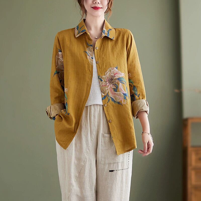 コットンとリネンのレディースシャツ 2022 春と秋のルーズな大きいサイズのレトロなプリントラペルシングルブレストリネンカーディガントップ 大きめサイズ スプリング 春物 オータム 秋物 sine53385026818