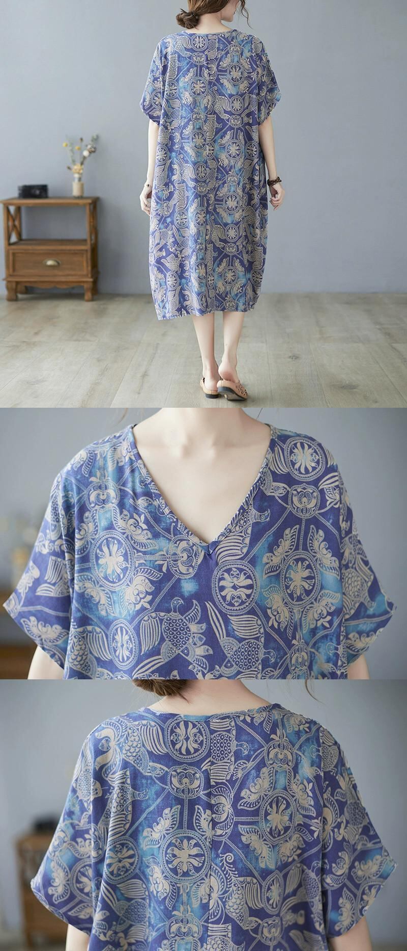 綿とリネンのドレス夏の新しい緩い脂肪 mm カバー肉 eign スタイルの印刷 V ネック大きいサイズの女性のレトロなミドル丈スカート コットン 大きめサイズ サマー 夏物 Vネック sine43428294439