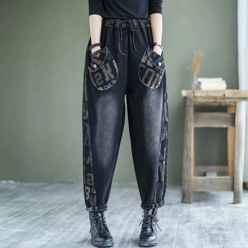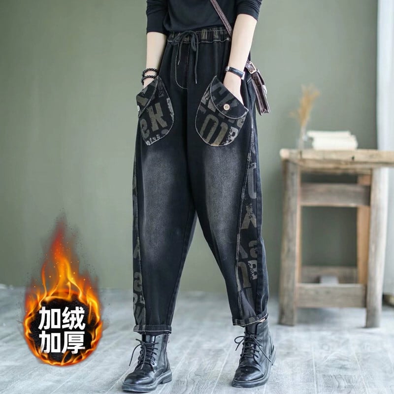 ファットシスターデニムハーレムパンツ女性の秋 2021 冬服ルーズ大きいサイズプリントユーズド加工ベルベットキャロットパンツ 大きめサイズ オータム 秋物 ウィンター 冬物 sine74808664840